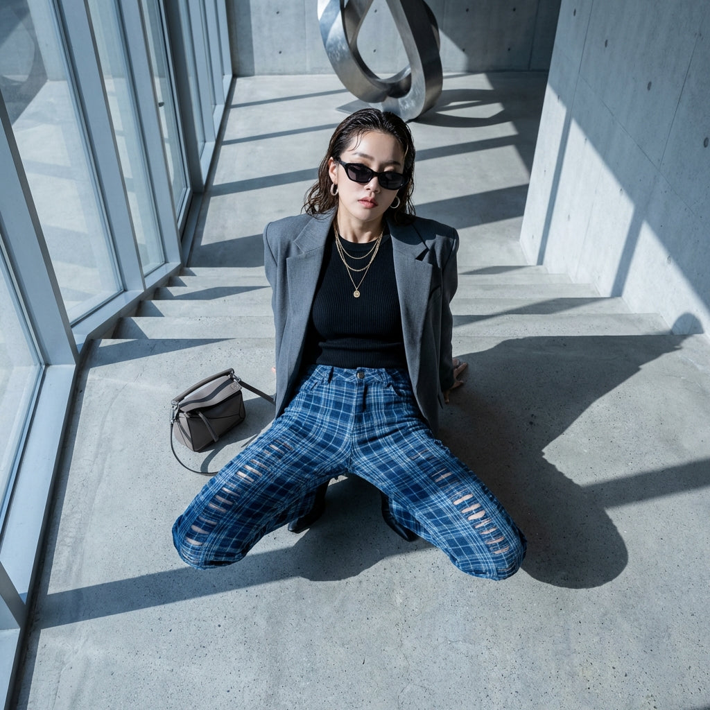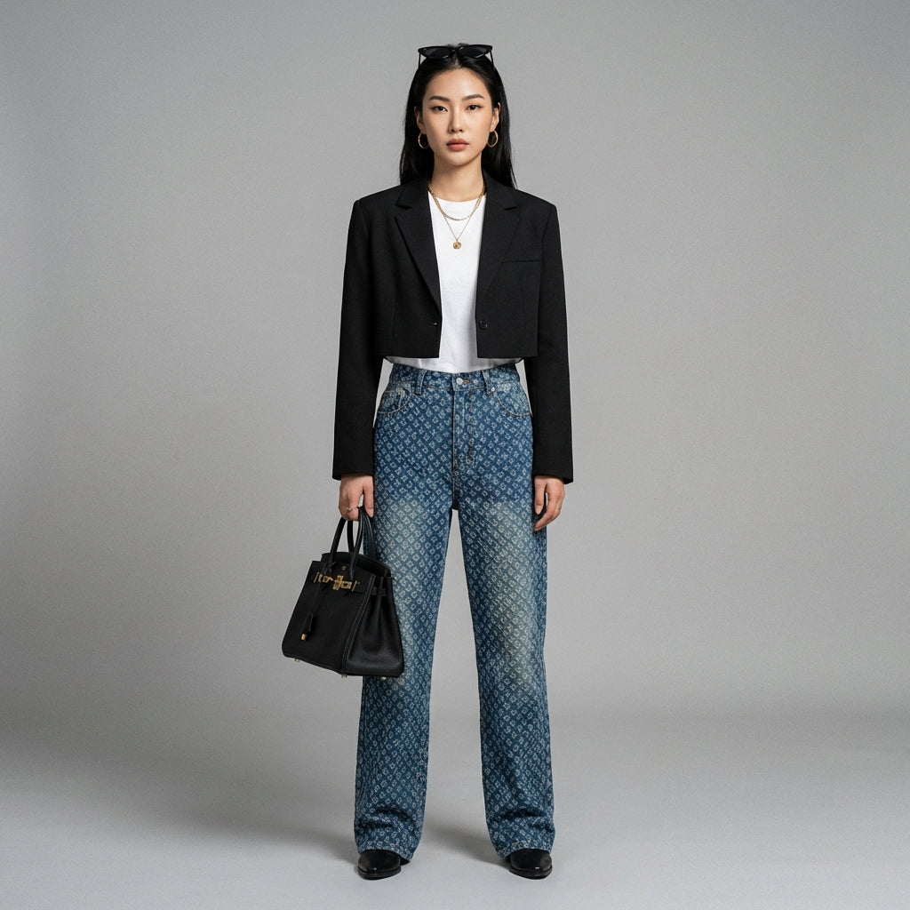 - Typ: High-Waist-Jeans, lockerer Schnitt, ausgehöhlte Details. Eine lässige Silhouette, die Komfort und Originalität mit einem Hauch von Modernität verbindet.