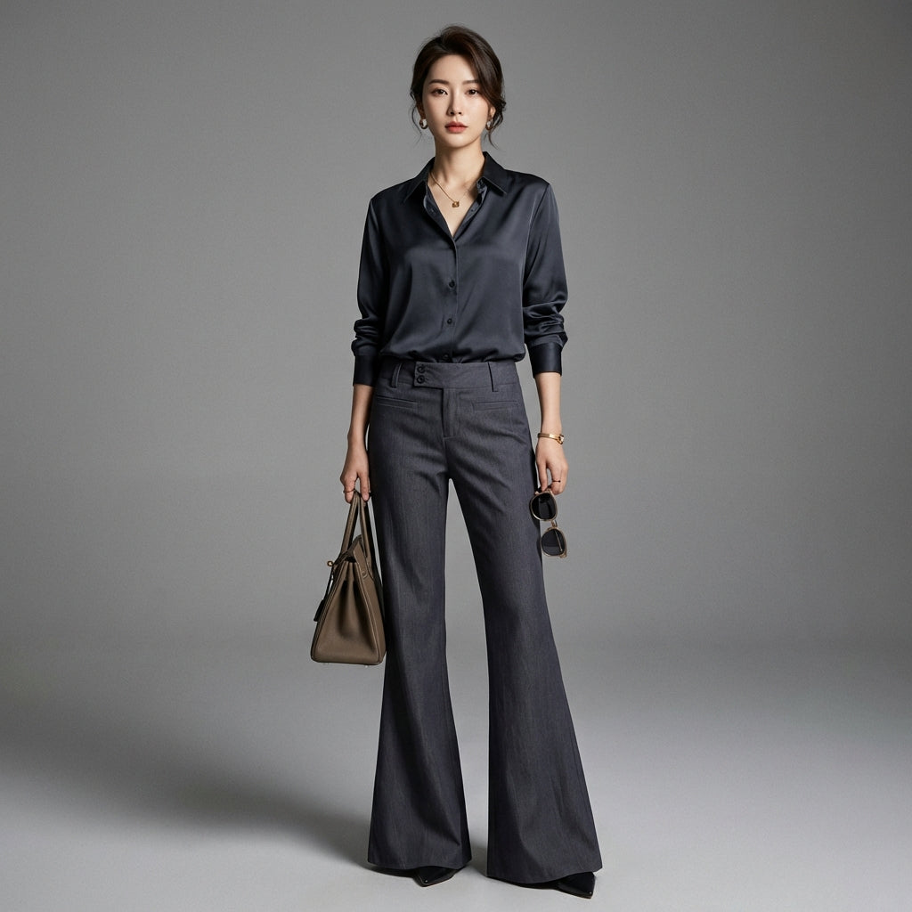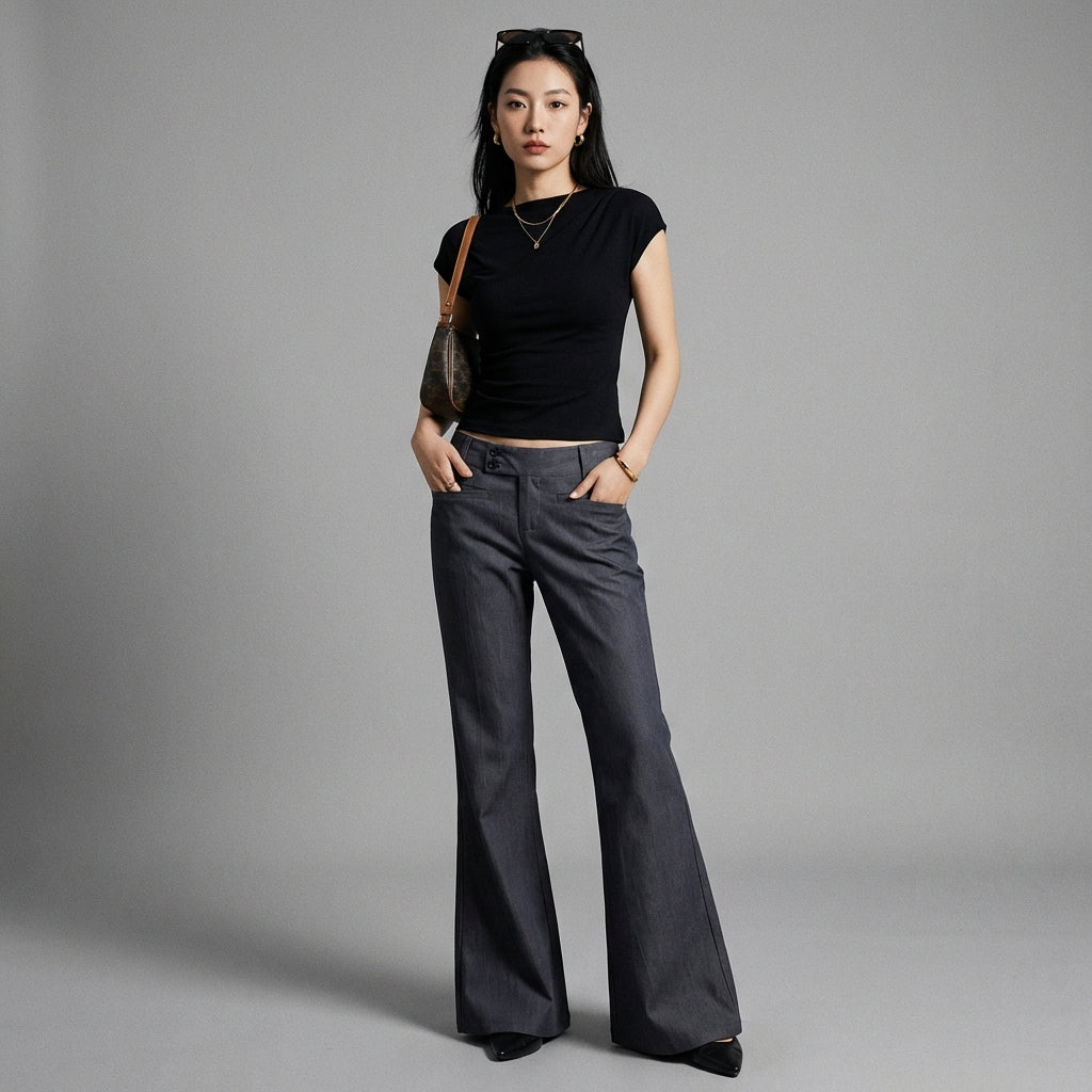 Betonen Sie Ihren Stil mit unserer tief sitzenden Schlaghose, die für eine schlanke und trendige Silhouette entworfen wurde. Ihr einzigartiger "Hufeisen"-Schnitt und der leicht dehnbare Stoff schmiegen sich an Ihre Formen an und sorgen für optimalen Komfort und einen gewagten Look! ✨