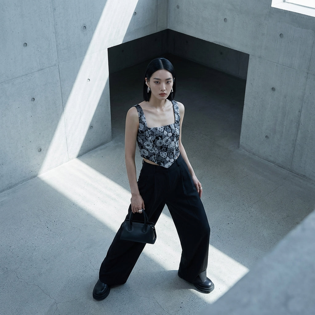 - Stil: K-Fashion, Trend, Urban. Dieses Top verkörpert den Geist der zeitgenössischen koreanischen Mode, mit einem modernen Schnitt und einem auffälligen Print.