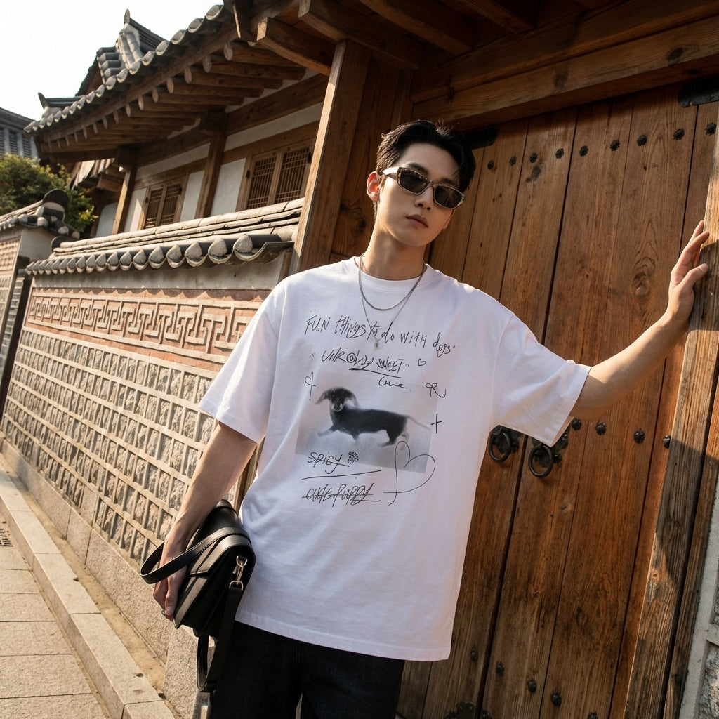 - Stil: Streetwear, Lässig, K-Fashion. Dieses T-Shirt verkörpert den Geist der koreanischen Mode, mit einem weiten Schnitt und einem modernen Aufdruck, perfekt für einen urbanen und stilvollen Look.
