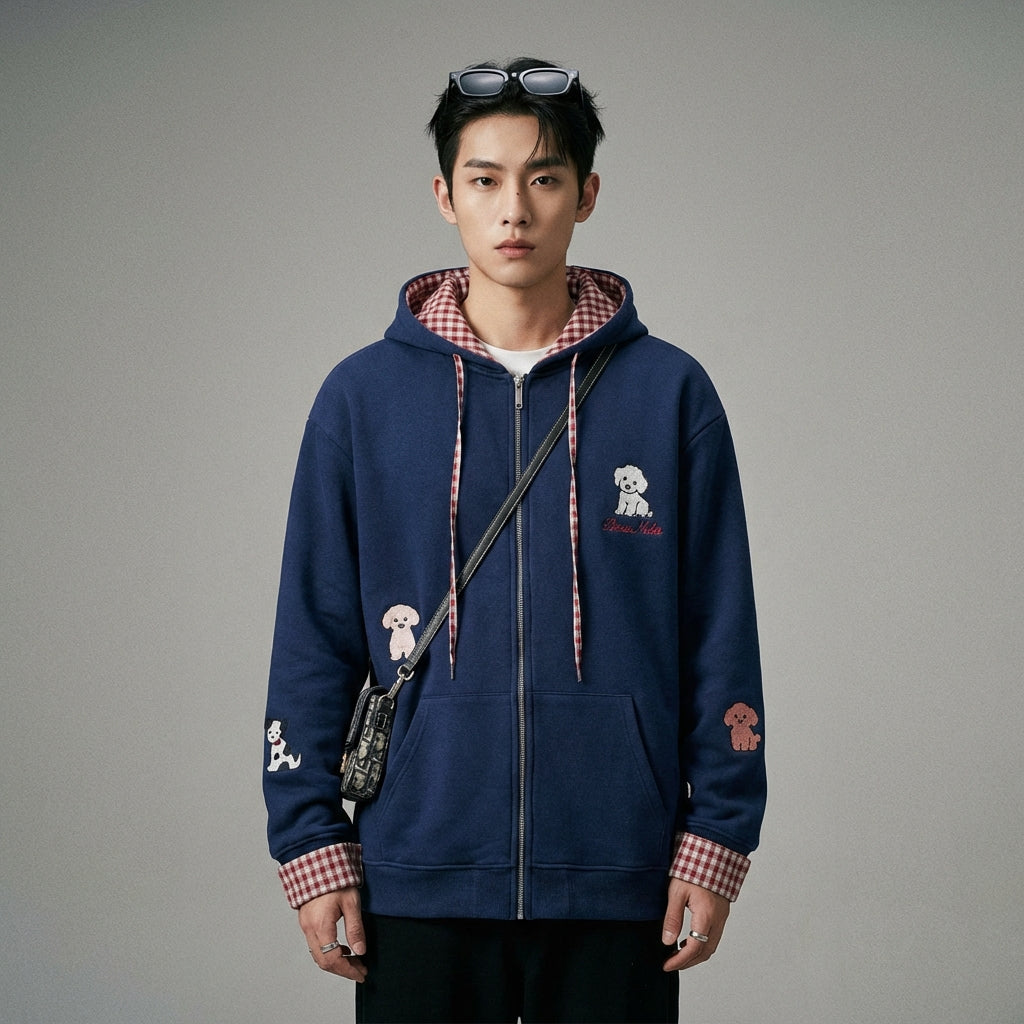 Kreieren Sie einen lässigen und trendigen Look mit unserem bestickten Kapuzen-Cardigan, ideal für alle Gelegenheiten. Sein bequemer Schnitt und sein einzigartiges Design machen ihn zu einem Must-have in Ihrer Garderobe! 🐶