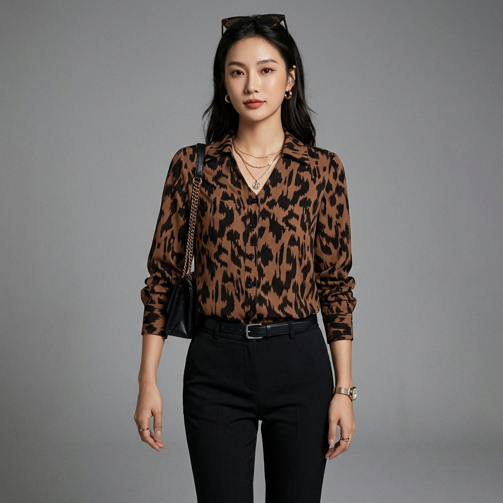 Betonen Sie Ihren Stil mit unserer Bluse mit Johnny-Kragen und langen Ärmeln, verziert mit einem gewagten Leopardenmuster. Ihr figurbetonter Schnitt schmeichelt der Silhouette, während der Knopfverschluss einen Hauch von Raffinesse verleiht. Perfekt für einen lässig-eleganten Look oder einen stilvollen Abend! 🐆