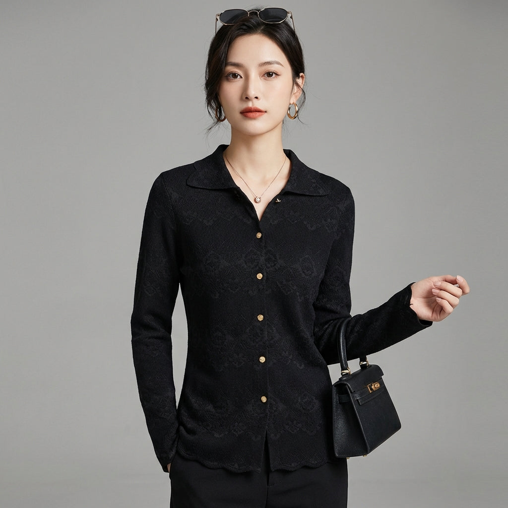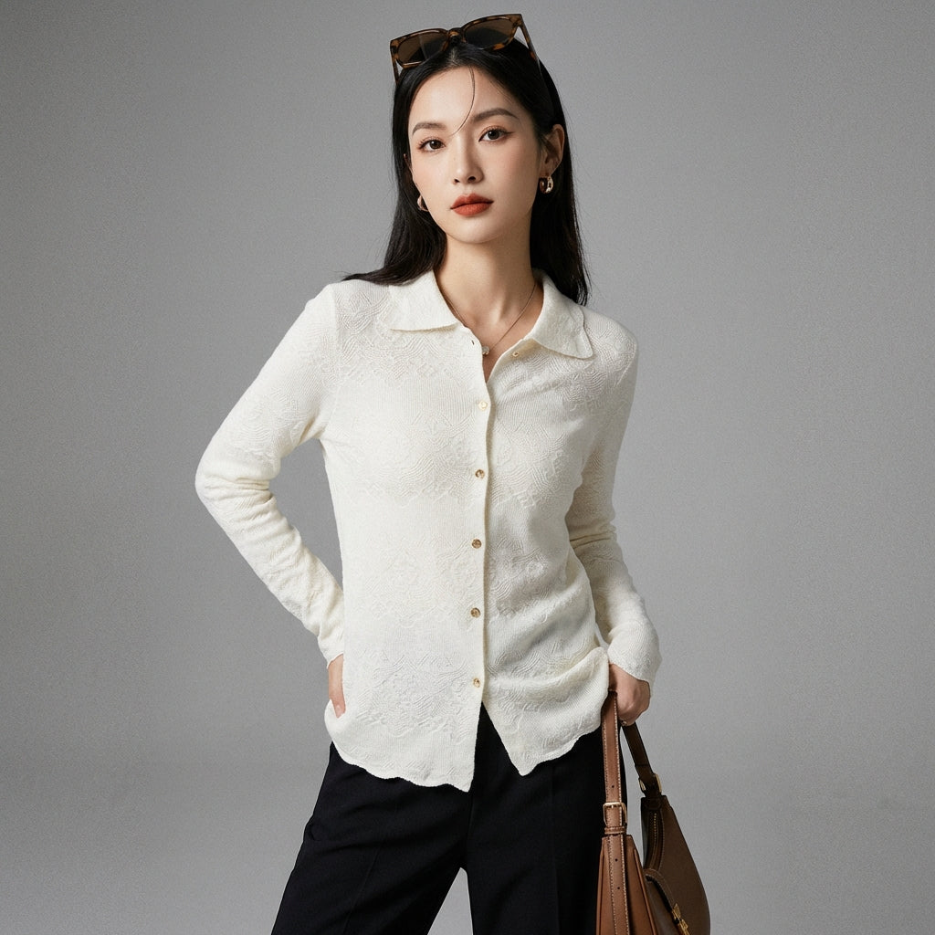 Entdecken Sie unaufdringliche Eleganz mit unserem Strickcardigan, der mit einem raffinierten Hemdkragen und Spitzenbesatz versehen ist. Sein taillierter Schnitt schmeichelt der Figur, ideal für einen schicken und professionellen Alltagslook! 🌸
