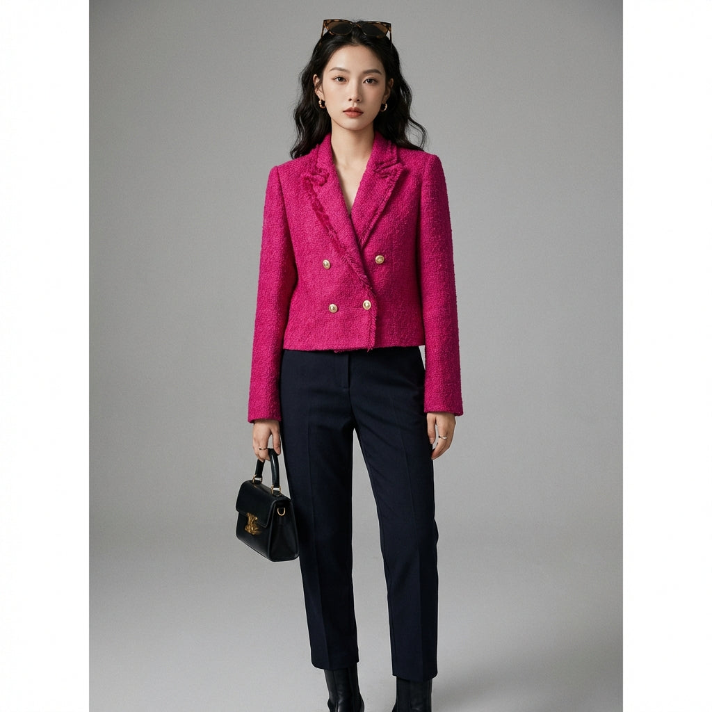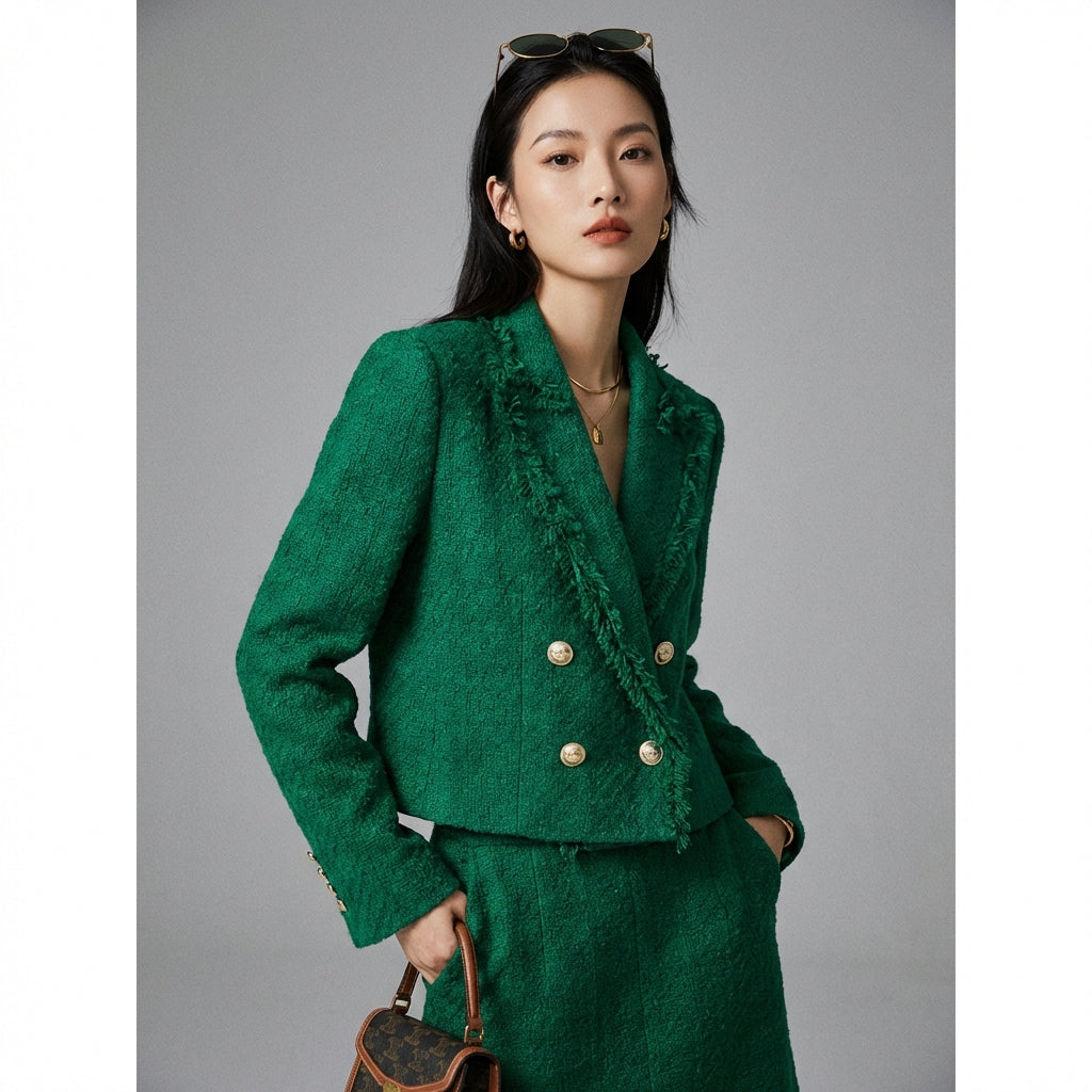 • Typ: Kurz, Zweireihig. Ein moderner Schnitt, der die Silhouette betont, mit sorgfältigen Details.