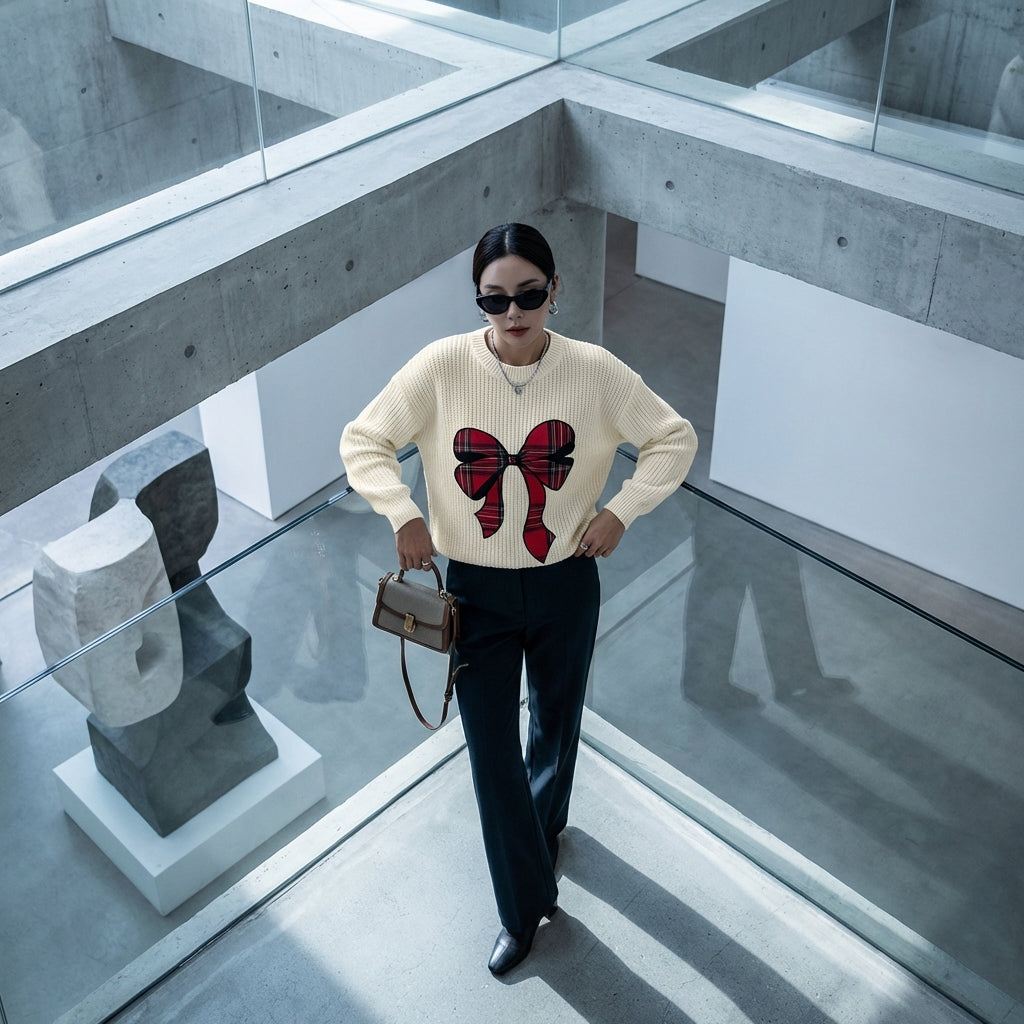 Kreieren Sie einen sanften und frischen Look mit unserem Rundhalspullover, der mit einer zarten Schleife verziert ist. Sein lockerer Schnitt und das dezente Karomuster machen ihn zu einem Must-have für einen lässigen und schicken Stil! 🎀