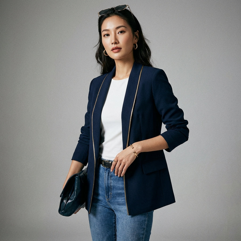 Betonen Sie Ihren Stil mit unserem taillierten Langarm-Blazer, einem unverzichtbaren Stück für einen raffinierten Look. Sein figurbetonter Schnitt und der gekerbte Reverskragen schmeicheln der Silhouette, während das knopflose Design einen modernen Touch verleiht. Perfekt für Arbeitstage und elegante Abende! 💫