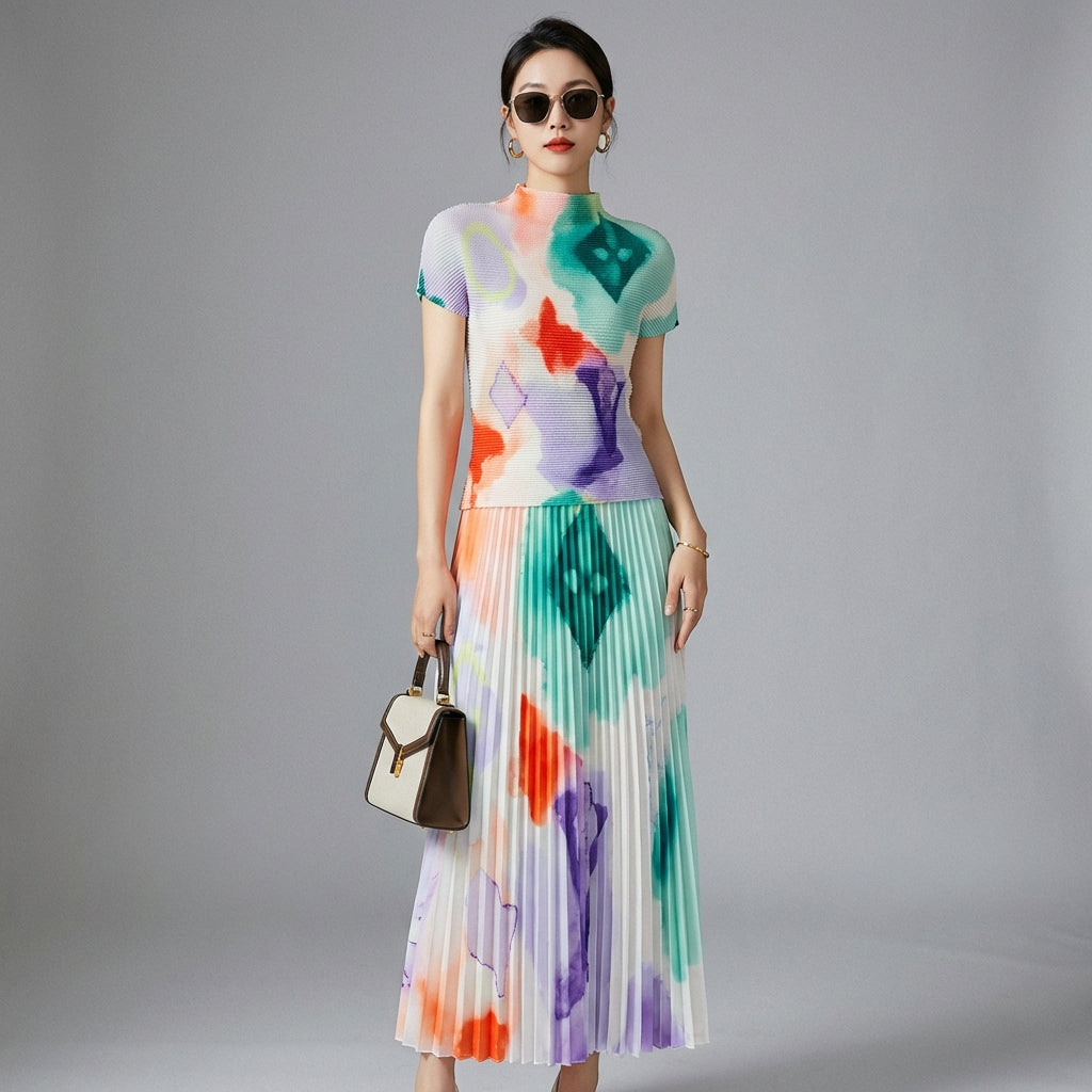Entdecken Sie unser bedrucktes Plissee-Set, perfekt für den Sommer. Dieses Duo besteht aus einem fließenden Plissee-Oberteil und einem langen Rock mit weitem Schwung, der eine elegante Silhouette und optimalen Komfort bietet. Ideal für einen raffinierten und trendigen Look! ✨