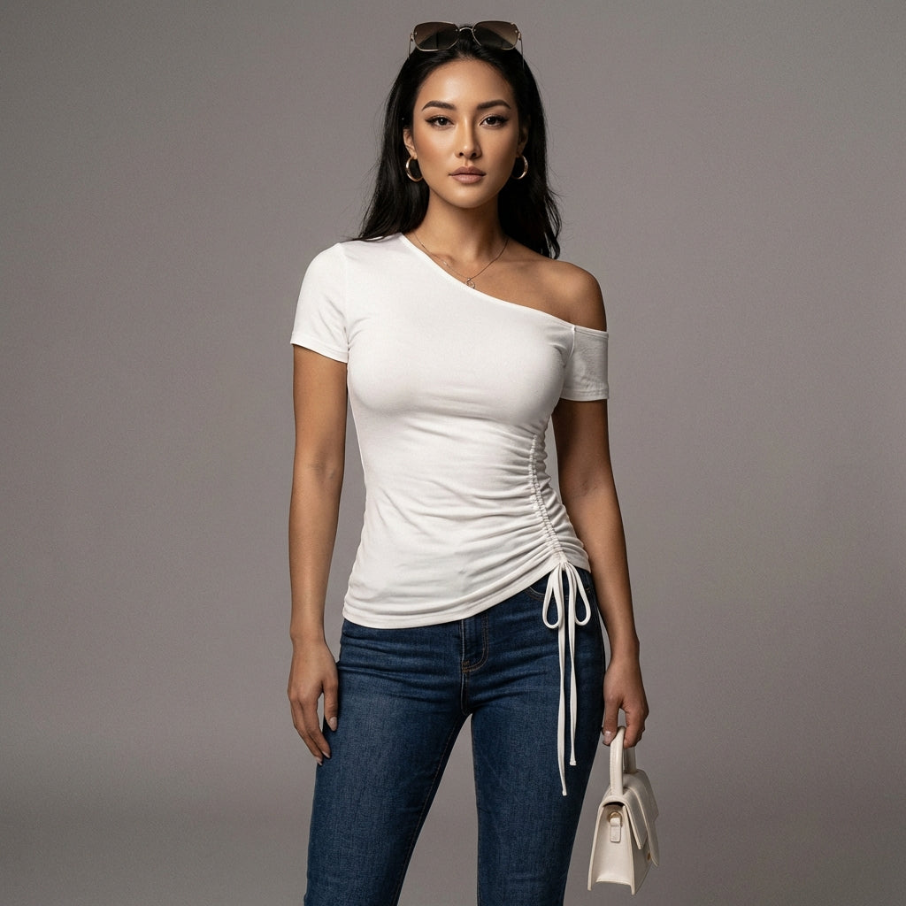 Betonen Sie Ihren Stil mit unserem bauchfreien T-Shirt mit Carmen-Ausschnitt, perfekt für sonnige Tage. Sein schmaler Schnitt und die plissierten Details verleihen Ihrer Sommergarderobe einen Hauch von Kühnheit, ideal für einen lässigen und trendigen Look! ☀️