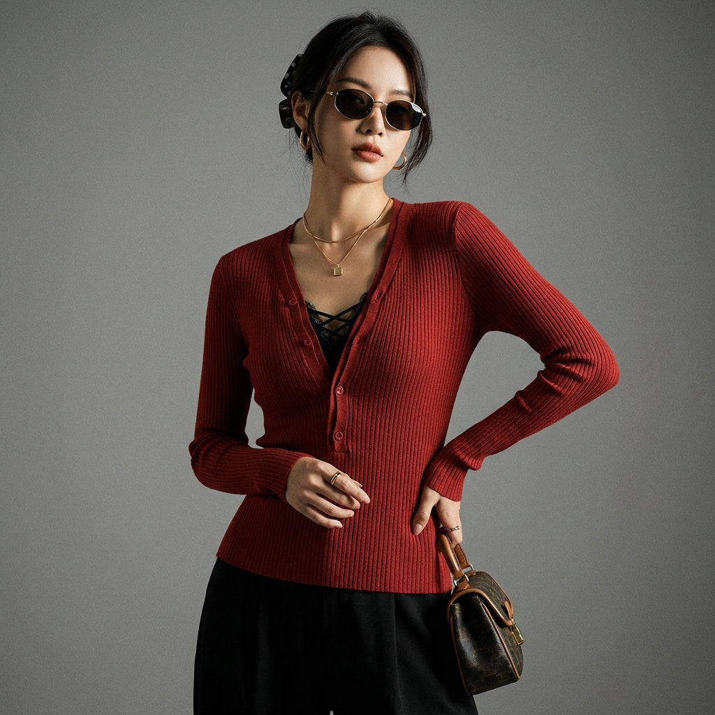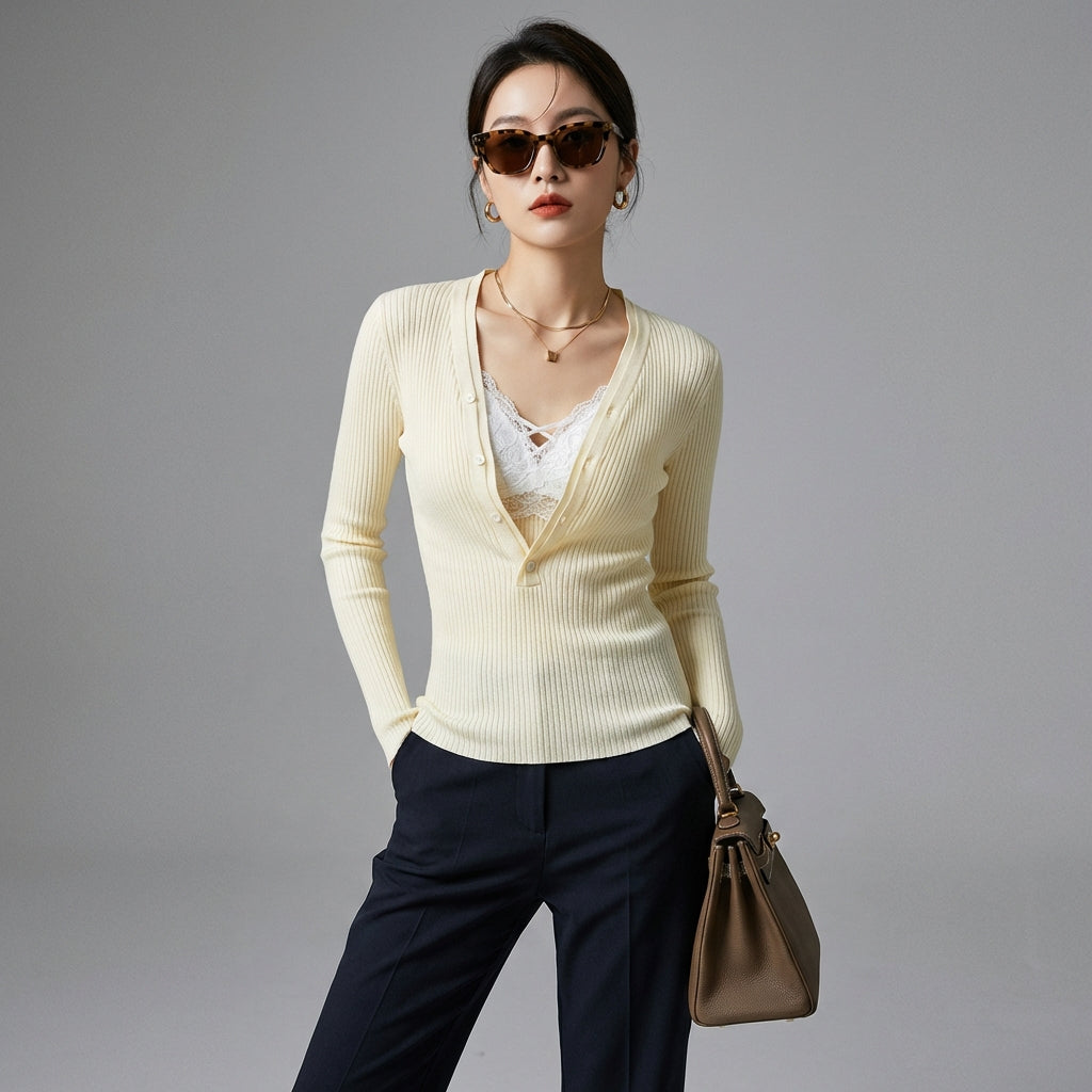 - Typ: Slim Fit, V-Ausschnitt. Ein figurbetonter Schnitt, der die Silhouette betont, kombiniert mit einem klassischen V-Ausschnitt für einen Hauch von Raffinesse.