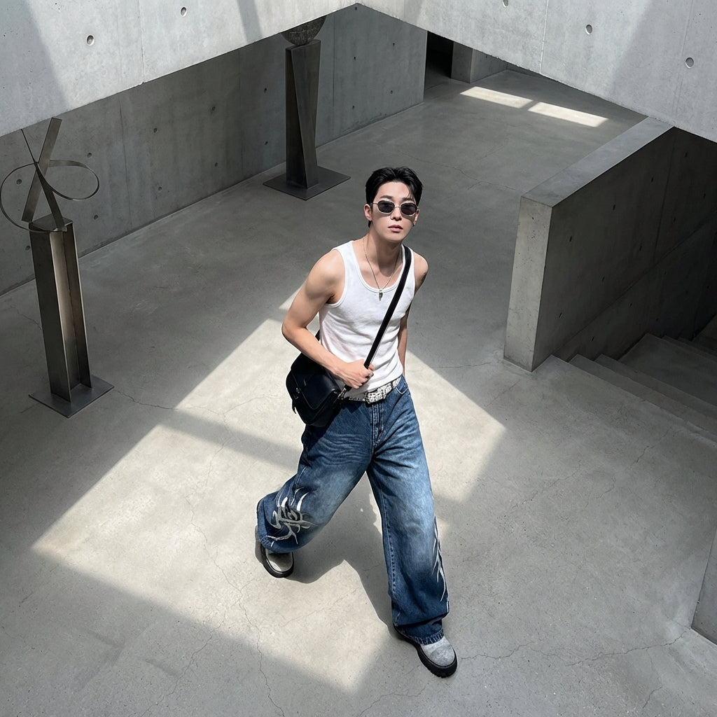 - Stil: Streetwear, Retro, Lässig. Diese Jeans verkörpert den Geist der koreanischen Urban Fashion, mit einem Vintage-Touch und optimalem Komfort für den Alltag.