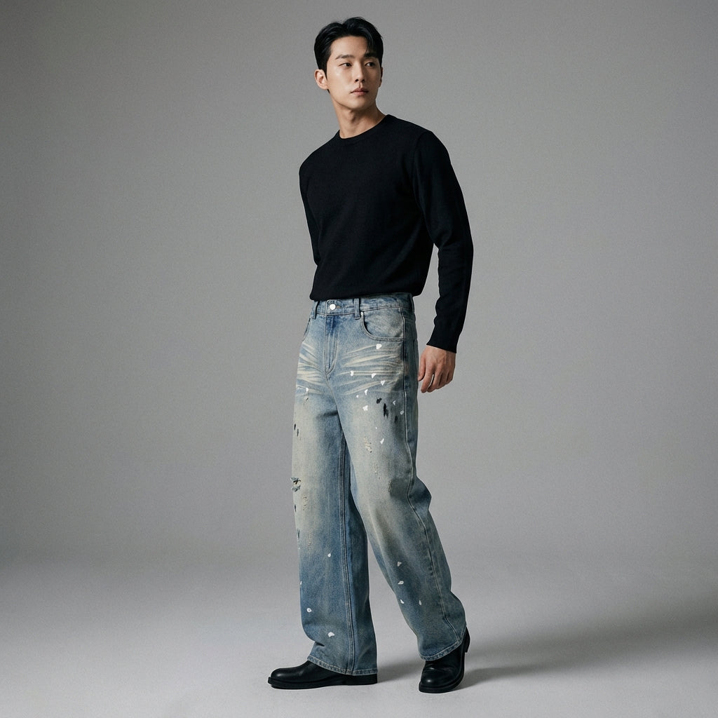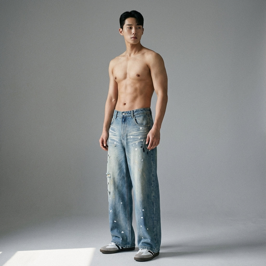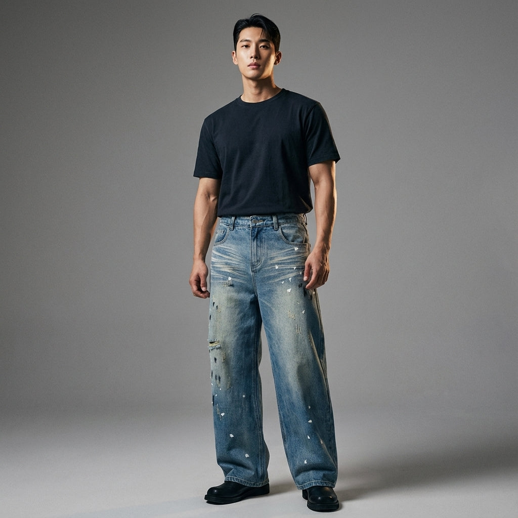 - Stil: Streetwear, Retro, K-Fashion. Diese Jeans verkörpert den lässigen und kühnen Geist der koreanischen Urban Fashion, mit einem Vintage-Touch.