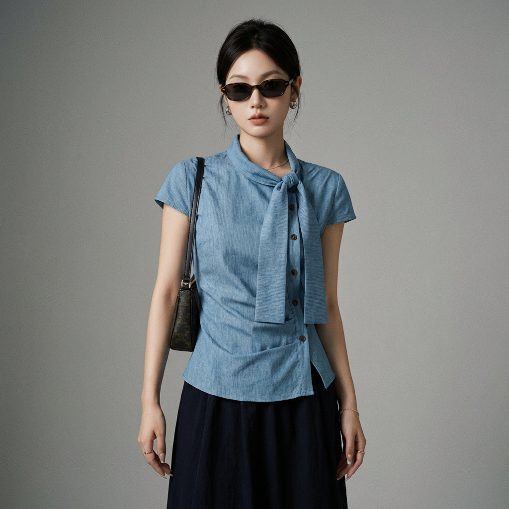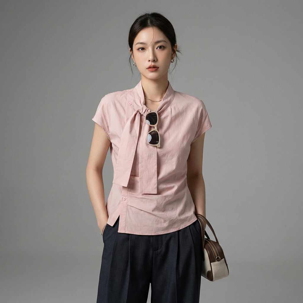 Kreieren Sie einen frischen und trendigen Look mit unserer kurzärmeligen Bluse, verziert mit einer zarten Schleife und subtilen Falten. Ihr asymmetrisches Design und die Streifen verleihen Ihrem Stil einen Hauch von Originalität und Sanftheit! 🎀