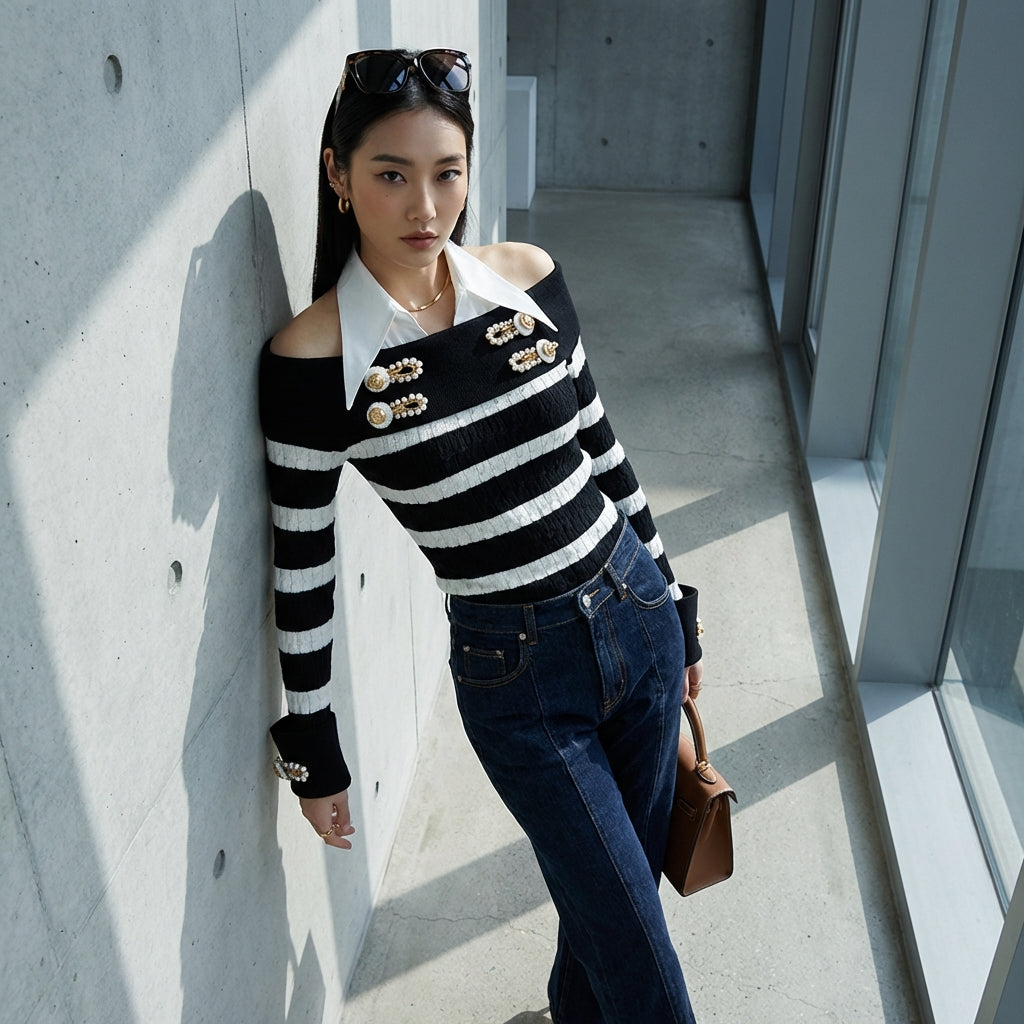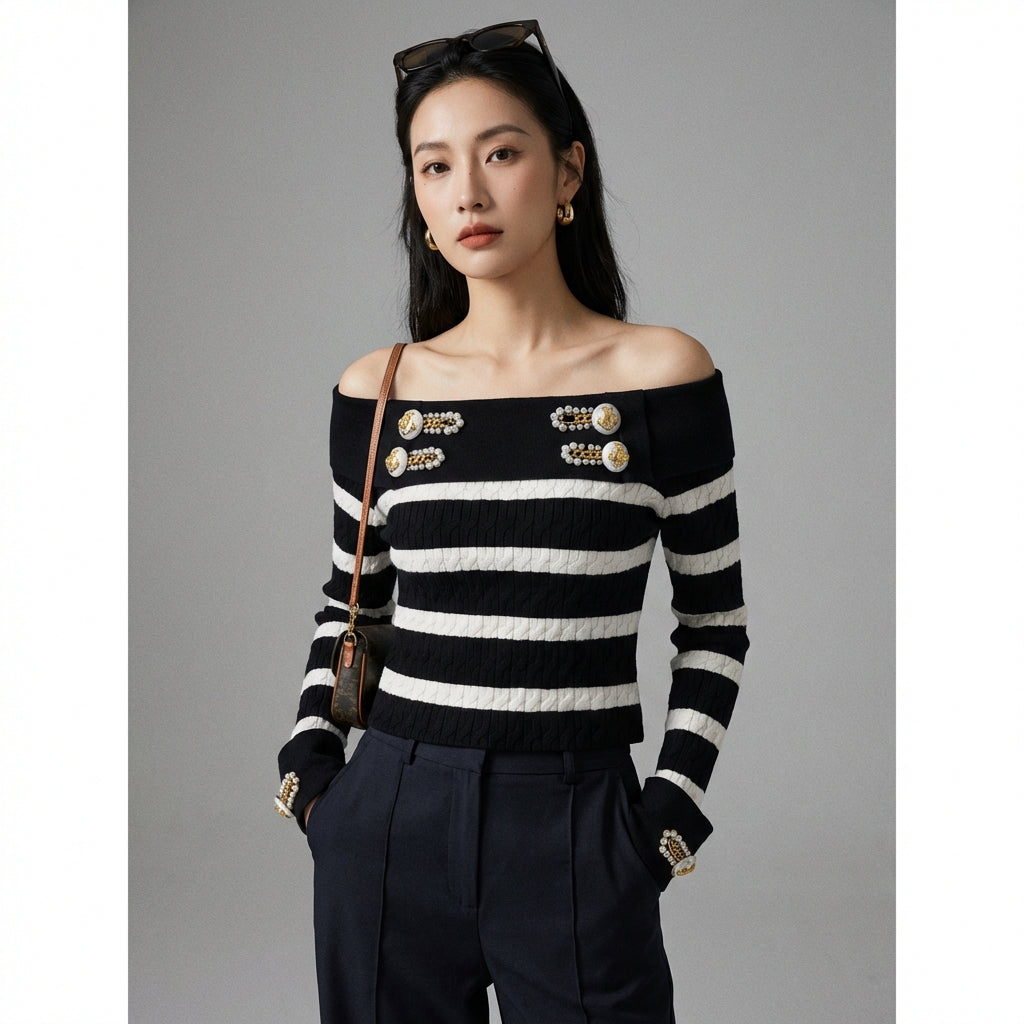 Kreieren Sie einen kühnen und trendigen Look mit unserem gestreiften Off-Shoulder-Pullover. Sein modernes Design und die schmale Passform machen ihn zu einem Must-have für einen lässigen und schicken Stil. Perfekt, um Ihrer Garderobe einen Hauch von Originalität zu verleihen! ✨