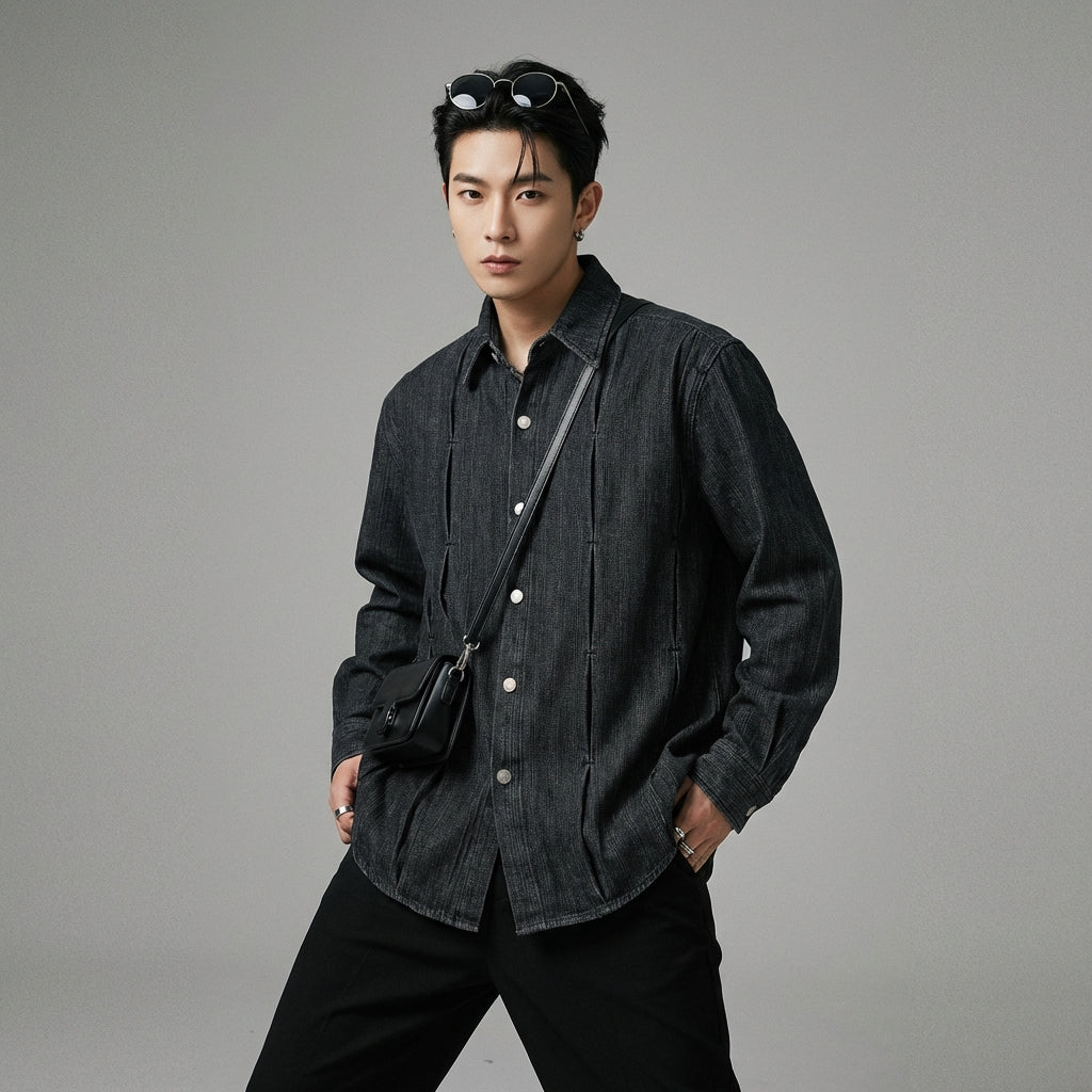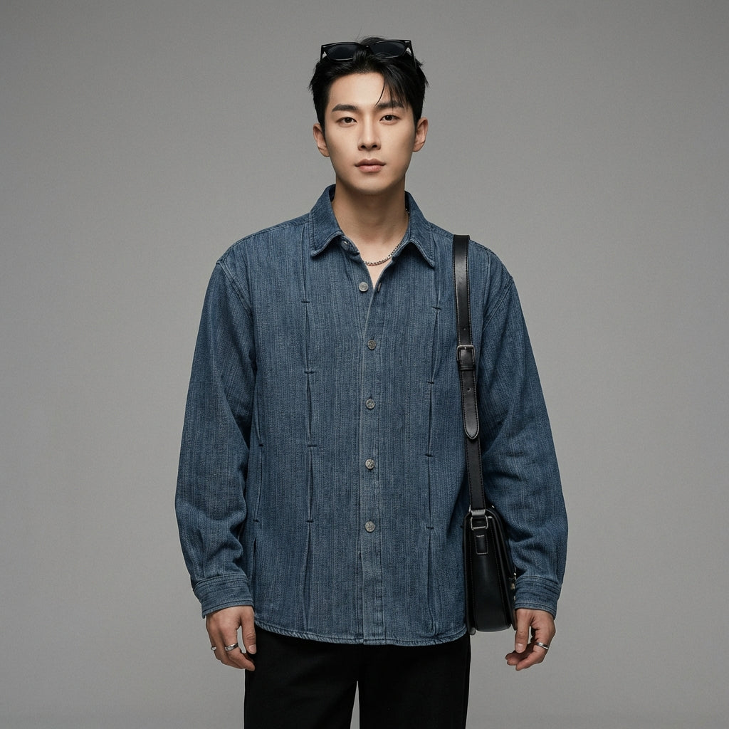 Kreieren Sie einen lässigen und stilvollen Look mit unserem plissierten Langarm-Denimhemd. Der klassische Hemdkragen und die dezenten Streifen verleihen Ihrer Garderobe einen Hauch von Originalität. Perfekt für einen Streetwear-Stil oder ein Alltagsoutfit! ✨