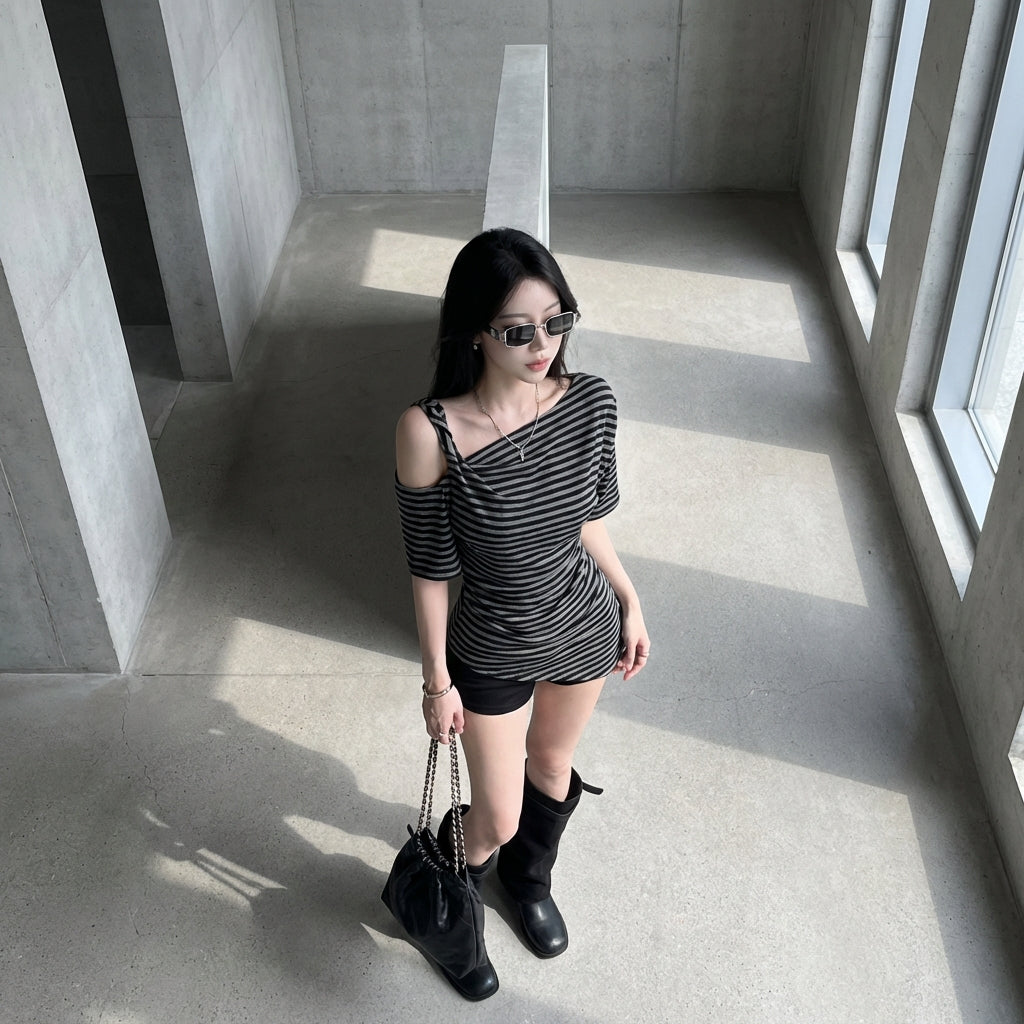 Entdecken Sie unser gestreiftes Kurzarm-T-Shirt, ein modernes und gewagtes Stück mit schrägem Kragen und figurbetontem Schnitt. Perfekt, um Ihrer Garderobe einen Hauch von Pepp zu verleihen! ✨