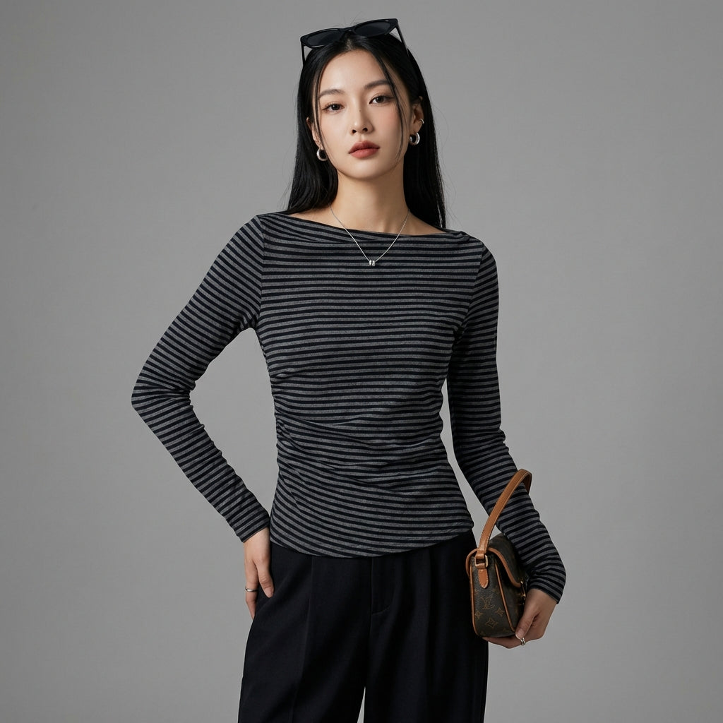 Kreieren Sie einen lässigen und schicken Look mit unserem Langarm-T-Shirt, das einen halb offenen Kragen und ein zeitloses Streifenmuster aufweist. Sein figurbetonter Schnitt betont Ihre Silhouette für einen urbanen und modernen Stil! ✨