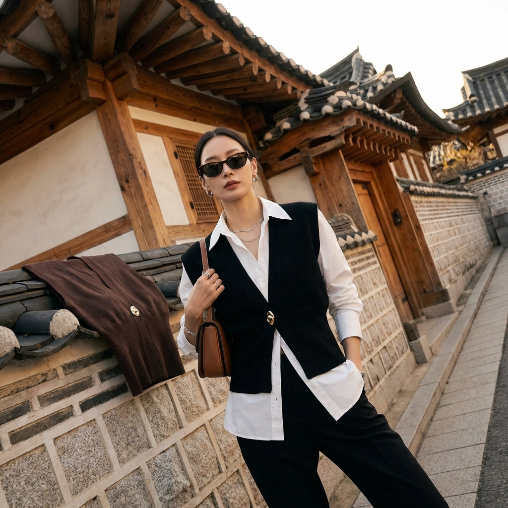 Mit ihrem zeitlosen Design und ihrer Vielseitigkeit wird diese Weste schnell zu einem unverzichtbaren Bestandteil Ihrer Koreanxwear-Garderobe und verleiht Ihrem Stil einen Hauch von dezenter Eleganz.
