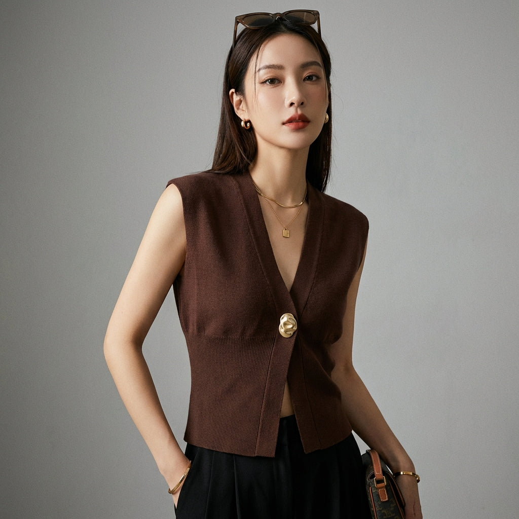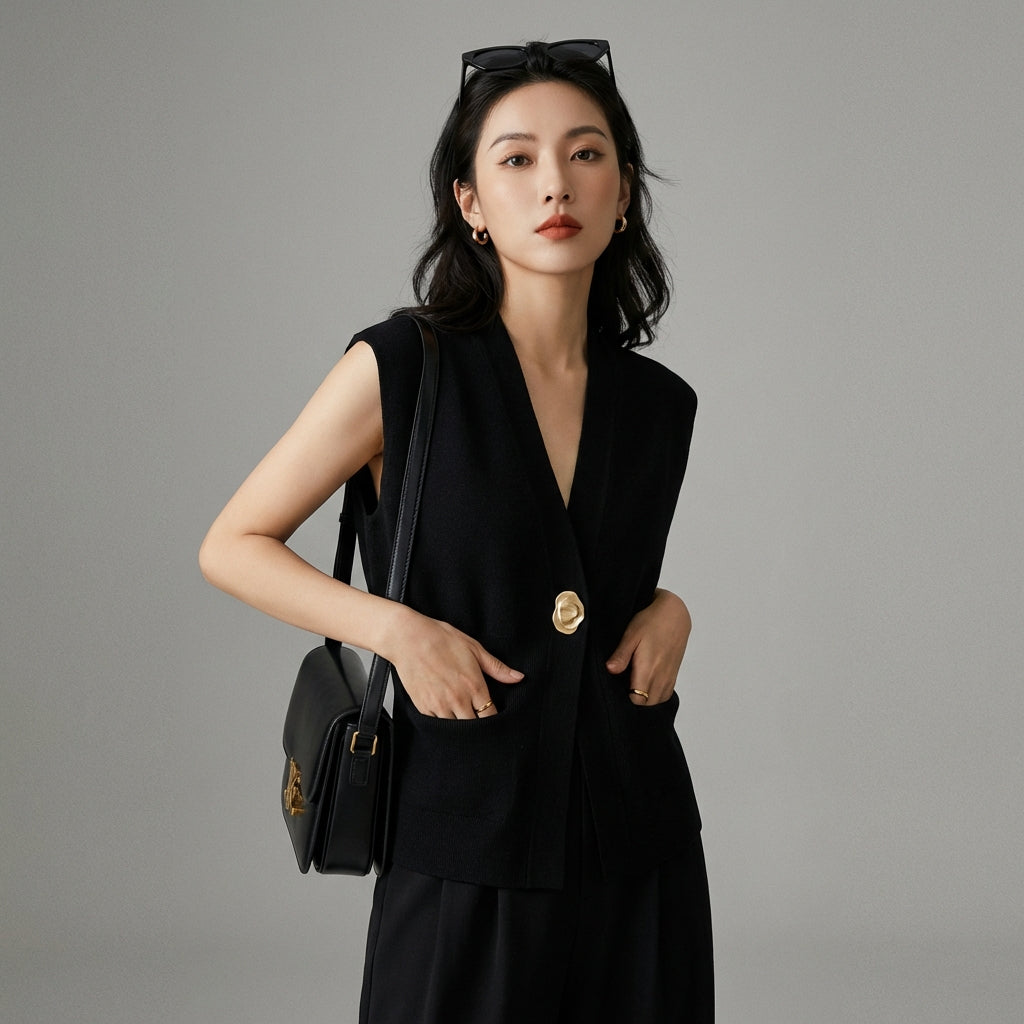 Kreieren Sie einen schicken und lässigen Look mit unserer ärmellosen Strickpulloverweste mit elegantem V-Ausschnitt und Knopfverschluss. Perfekt zum Überziehen oder allein tragen, diese Weste verleiht all Ihren Outfits einen Hauch von Raffinesse! ✨