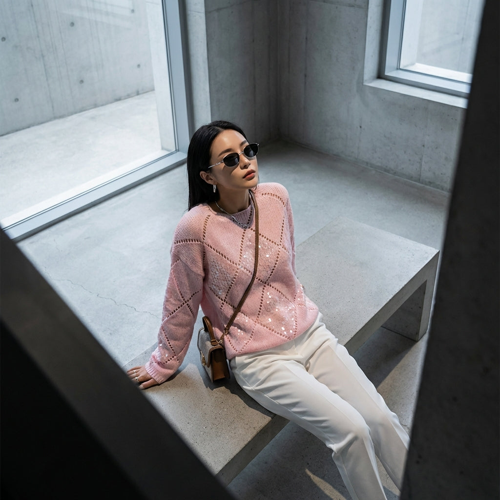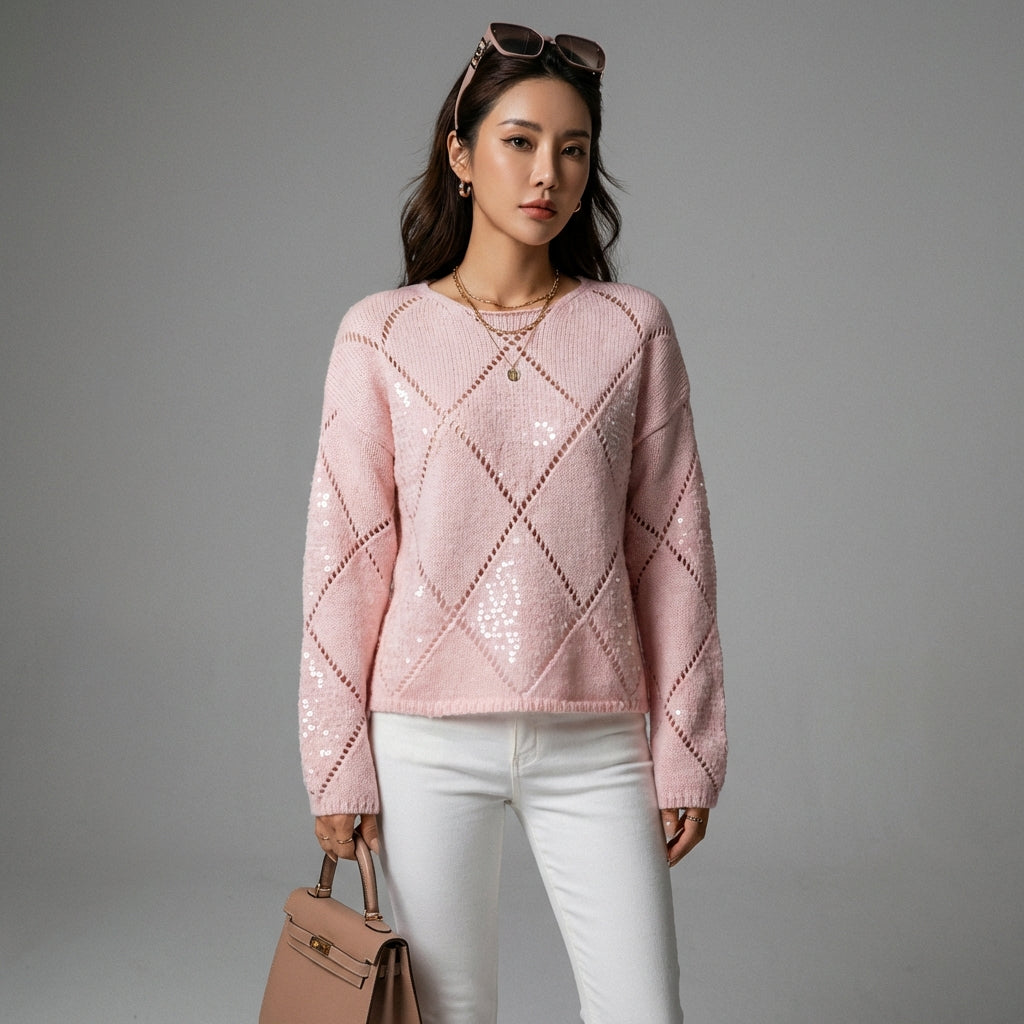 - Stil: K-Fashion, Trend, Casual Chic, Abend. Dieser Pullover verkörpert die moderne Eleganz der koreanischen Mode mit einem glamourösen Touch, ideal für einen raffinierten Look oder einen Abendausflug.