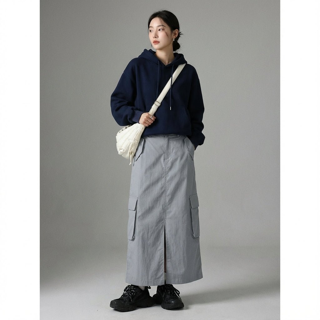 Kreieren Sie einen trendigen und bequemen Look mit unserem langen Damenrock im Workwear-Stil, perfekt für eine schlanke und moderne Silhouette. Sein H-Design bietet einen geraden und weichen Schnitt, ideal für alle Anlässe, vom Büro bis zu entspannten Ausflügen. 🍂