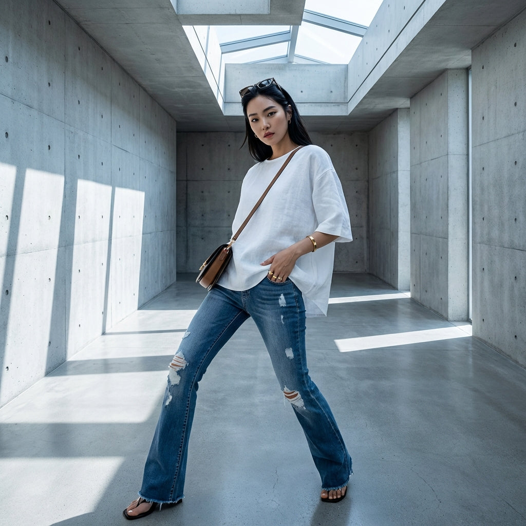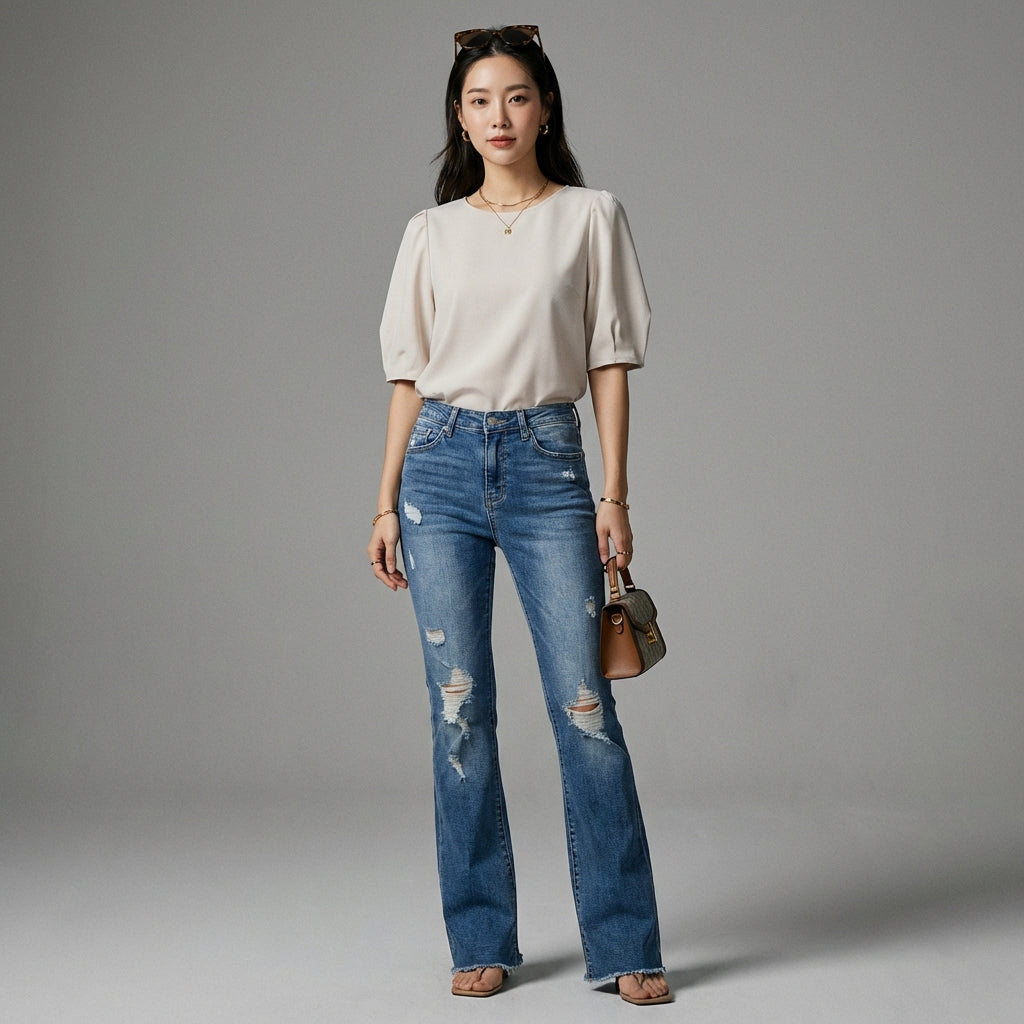 Diese Bootcut Jeans ist das ideale Kleidungsstück für einen lässigen und modernen Look, leicht zu kombinieren mit einem Crop Top oder einem Oversize-Pullover für einen selbstbewussten K-Fashion-Stil.