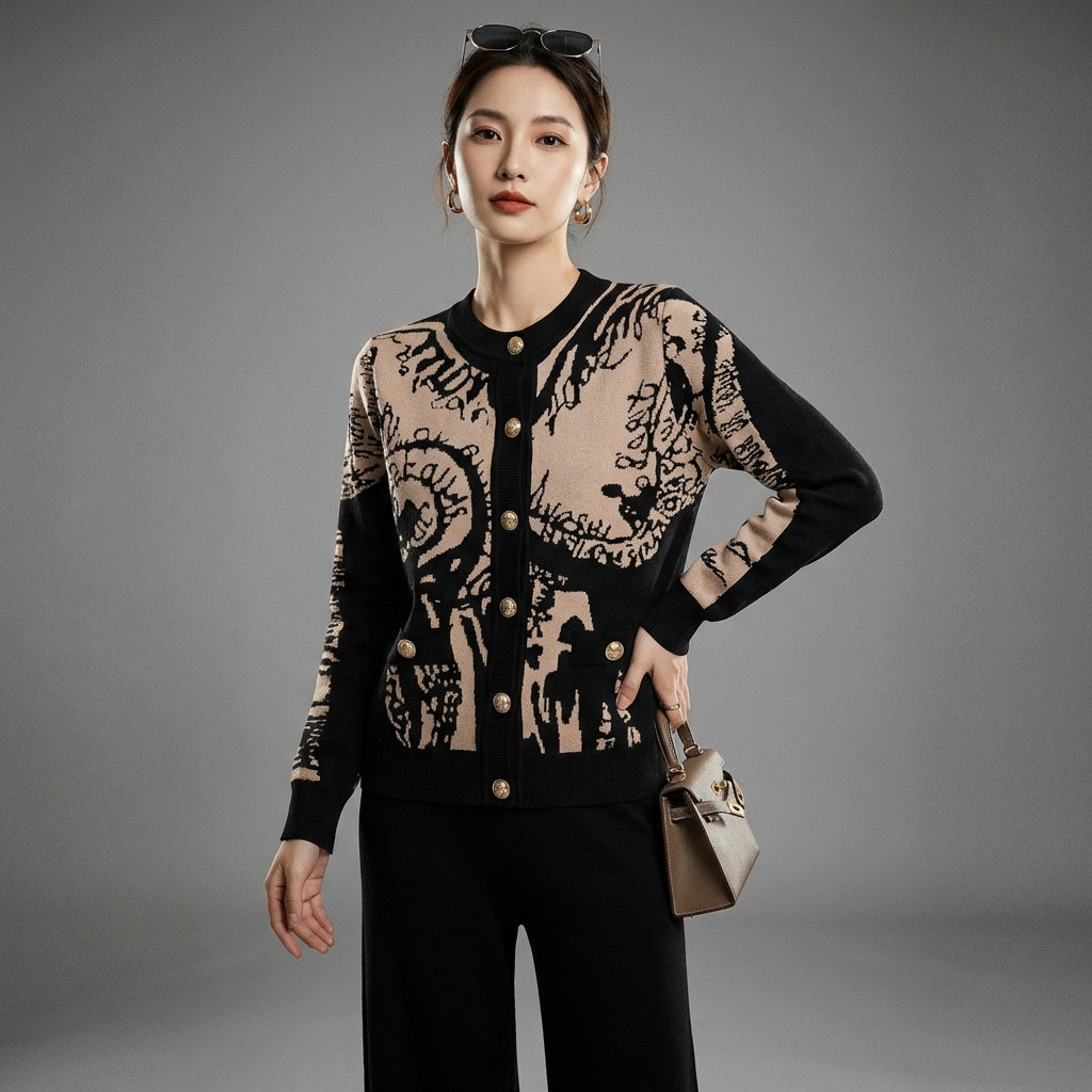 Kreieren Sie einen eleganten und lässigen Look mit unserem zweiteiligen Set, bestehend aus einem langärmeligen Strickpullover mit Knöpfen und einer passenden weiten Hose. Hergestellt aus einem raffinierten Jacquard-Stoff, bietet dieses Set optimalen Komfort und ein raffiniertes Aussehen, perfekt für alle Gelegenheiten! ✨