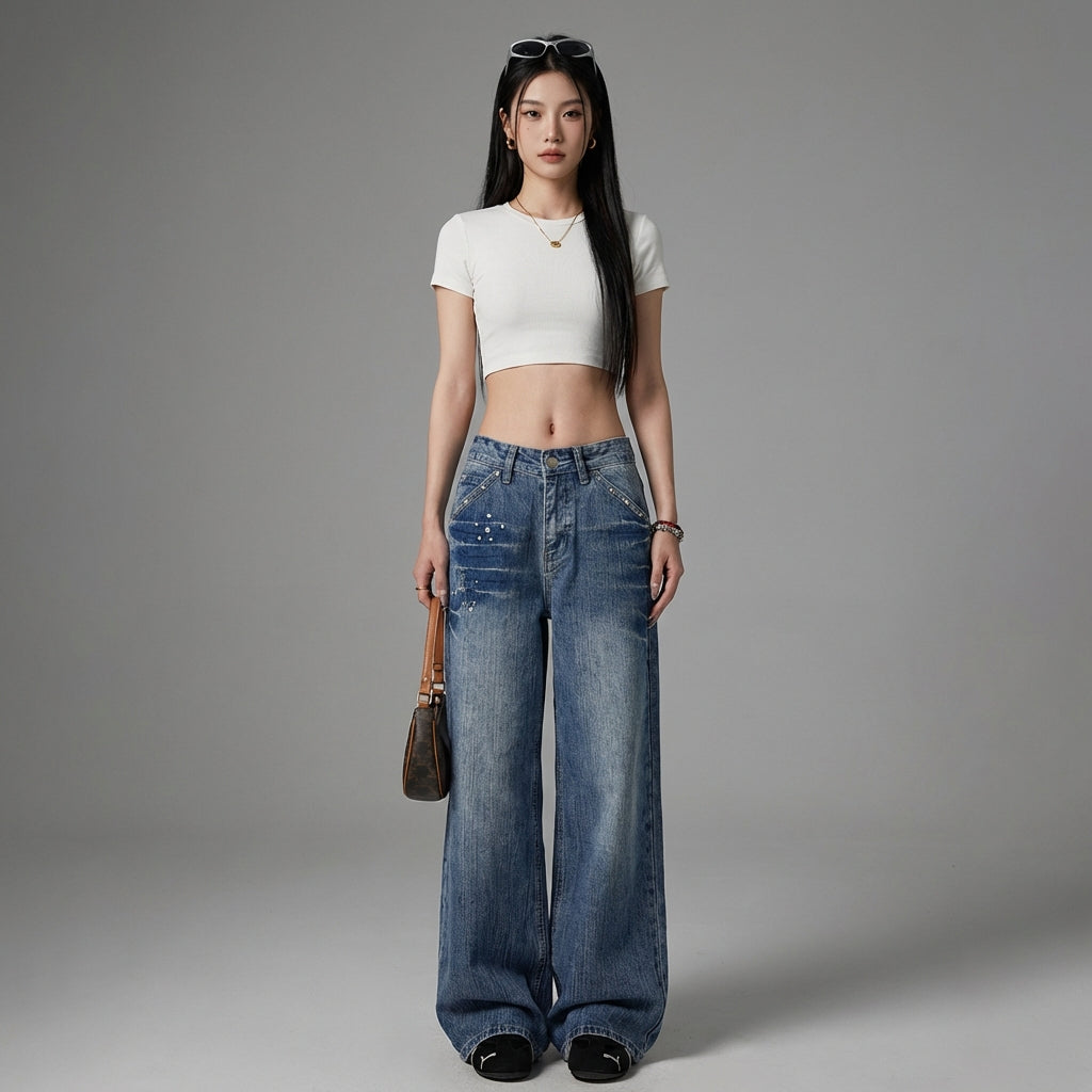 Kreieren Sie einen lässigen und trendigen Look mit unserer weit geschnittenen Jeans, die mit dezenten Nieten verziert ist. Der hohe Bund und der gerade Schnitt sorgen für eine gestreckte Silhouette und optimalen Komfort bei all Ihren täglichen Aktivitäten. Ein Must-have für einen selbstbewussten urbanen Stil! 👖