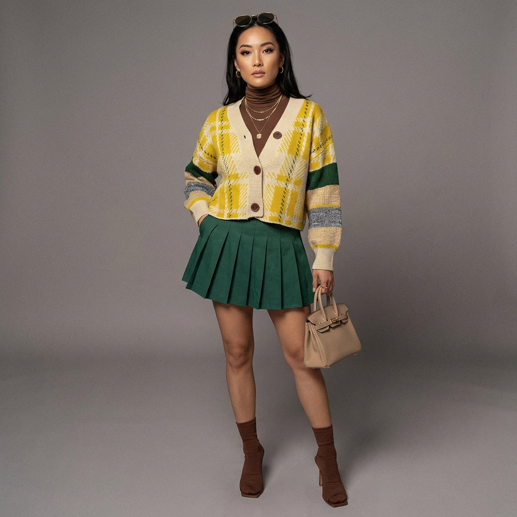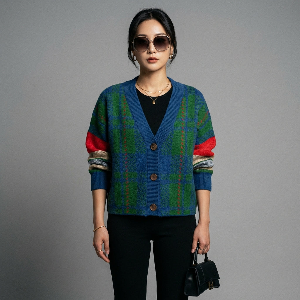 Kreieren Sie einen lässigen und schicken Look mit unserem karierten Strickcardigan. Dieses vielseitige Modell verfügt über einen V-Ausschnitt und überschnittene Ärmel für einen Oversize- und modernen Stil. Ideal zum Überziehen und um Ihren Alltagsoutfits einen Hauch von Raffinesse zu verleihen! ✨