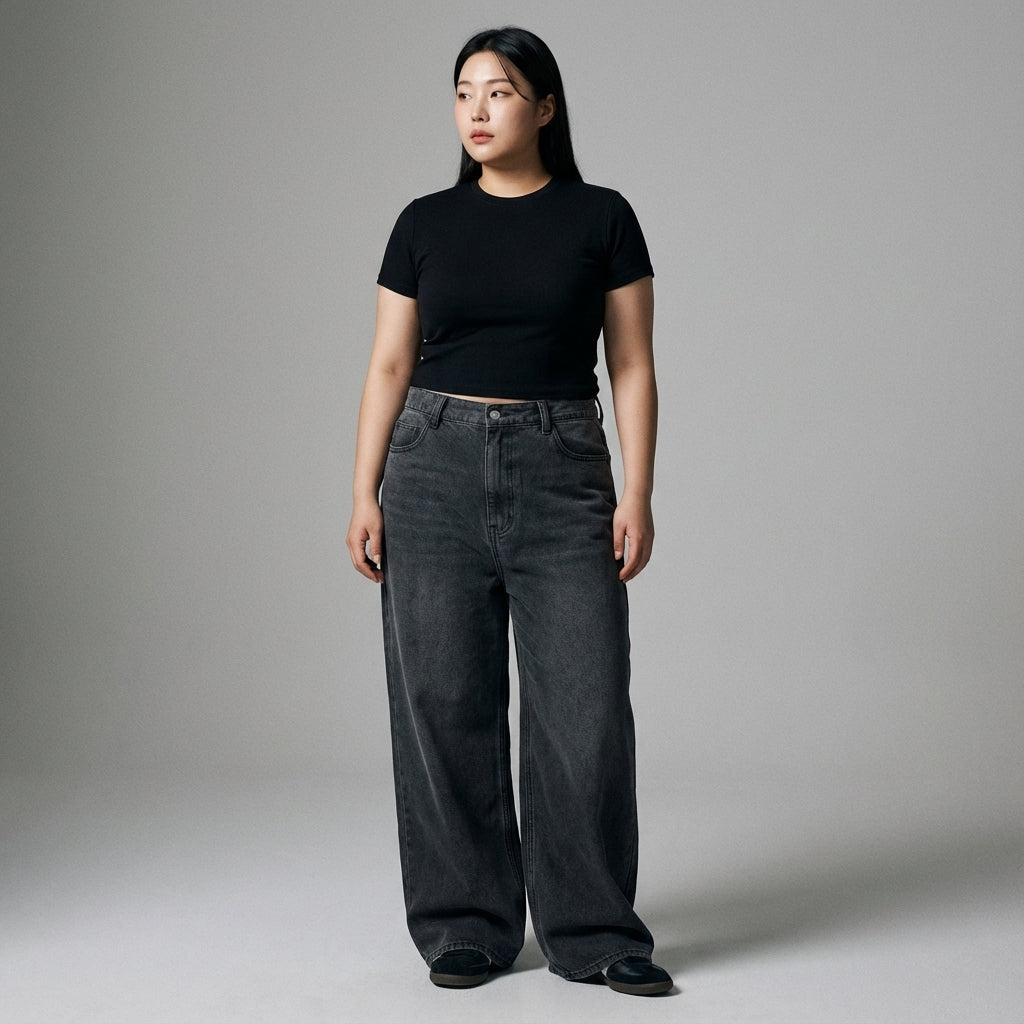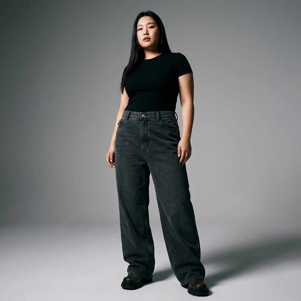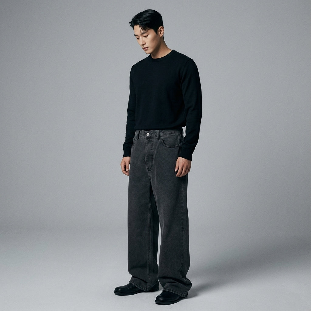 Diese weite Jeans ist das Herzstück für einen lässigen und eleganten Look, inspiriert von den neuesten Trends der koreanischen Mode.