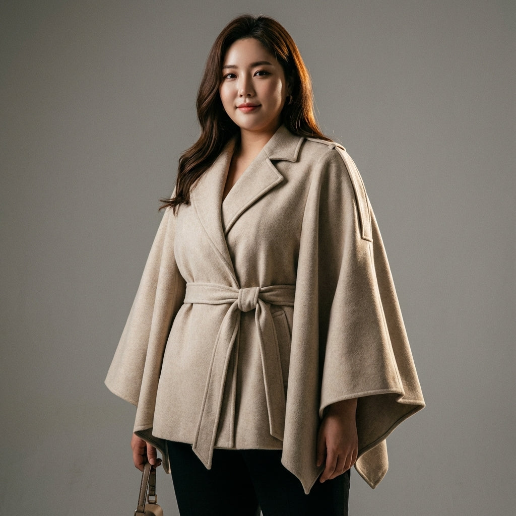 Erleben Sie Eleganz und Wärme mit unserem Koreanischen Winter Poncho Cape, einem Schlüsselstück, um kalten Tagen mit Raffinesse zu begegnen. Sein raffiniertes Design, verziert mit einem Reverskragen und einem Gürtel, schmeichelt allen Silhouetten, von Größe S bis 6XL. Perfekt für einen schicken und bequemen Look! ❄️