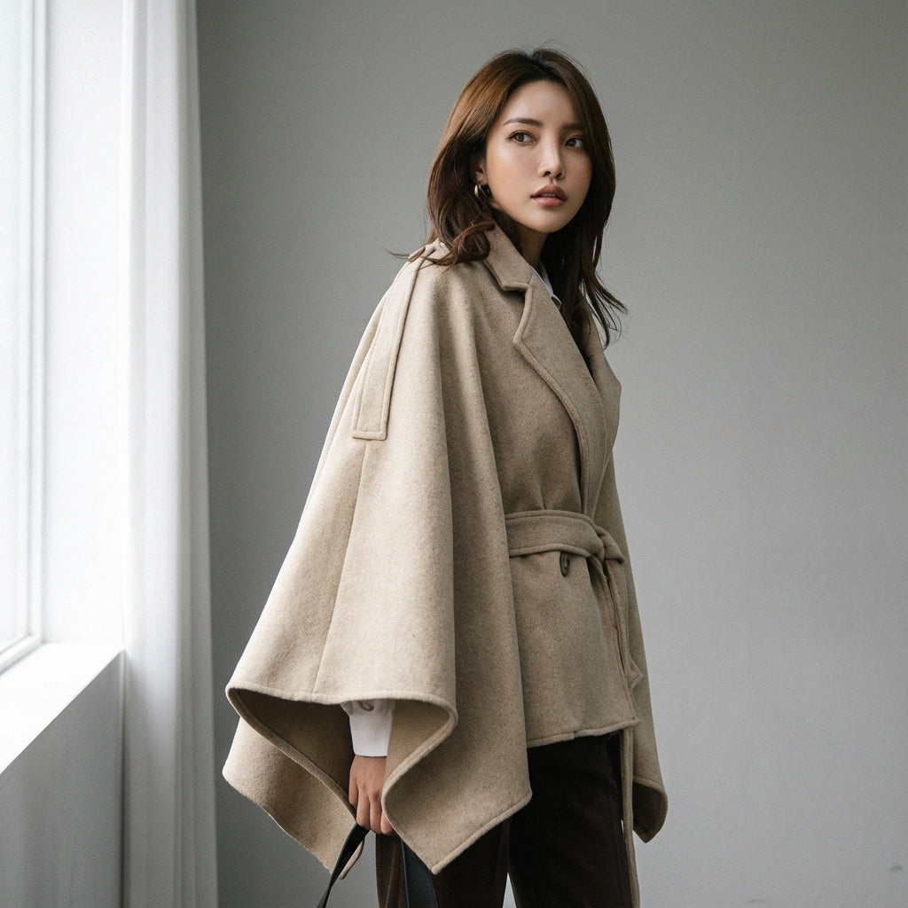 - Typ: Poncho Cape, Mittellang, Oversize. Ein weiter und fließender Schnitt, der große Bewegungsfreiheit und eine majestätische, umhüllende Ausstrahlung bietet.