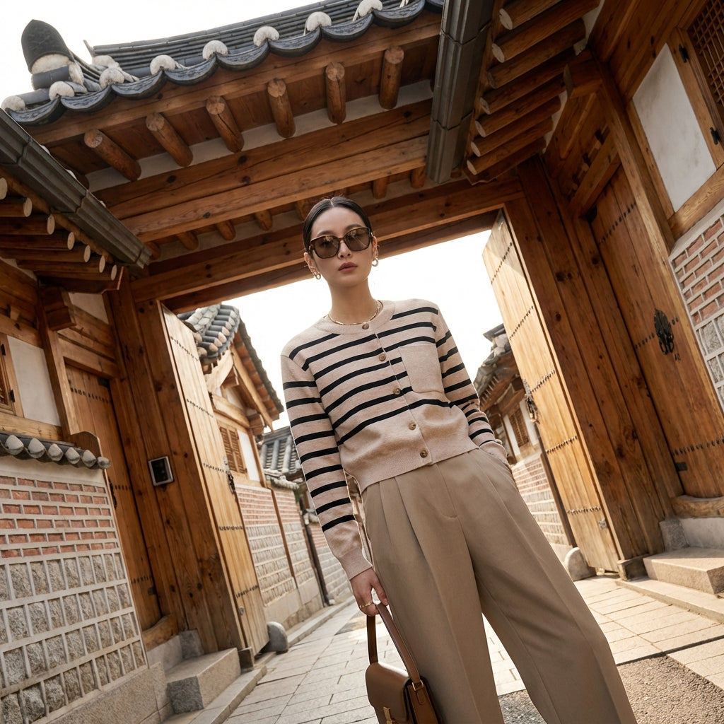 Dieser gestreifte Cardigan ist das ideale Stück für einen frischen und modernen Look, perfekt für alle, die Komfort und Stil im koreanischen Modestil kombinieren möchten.