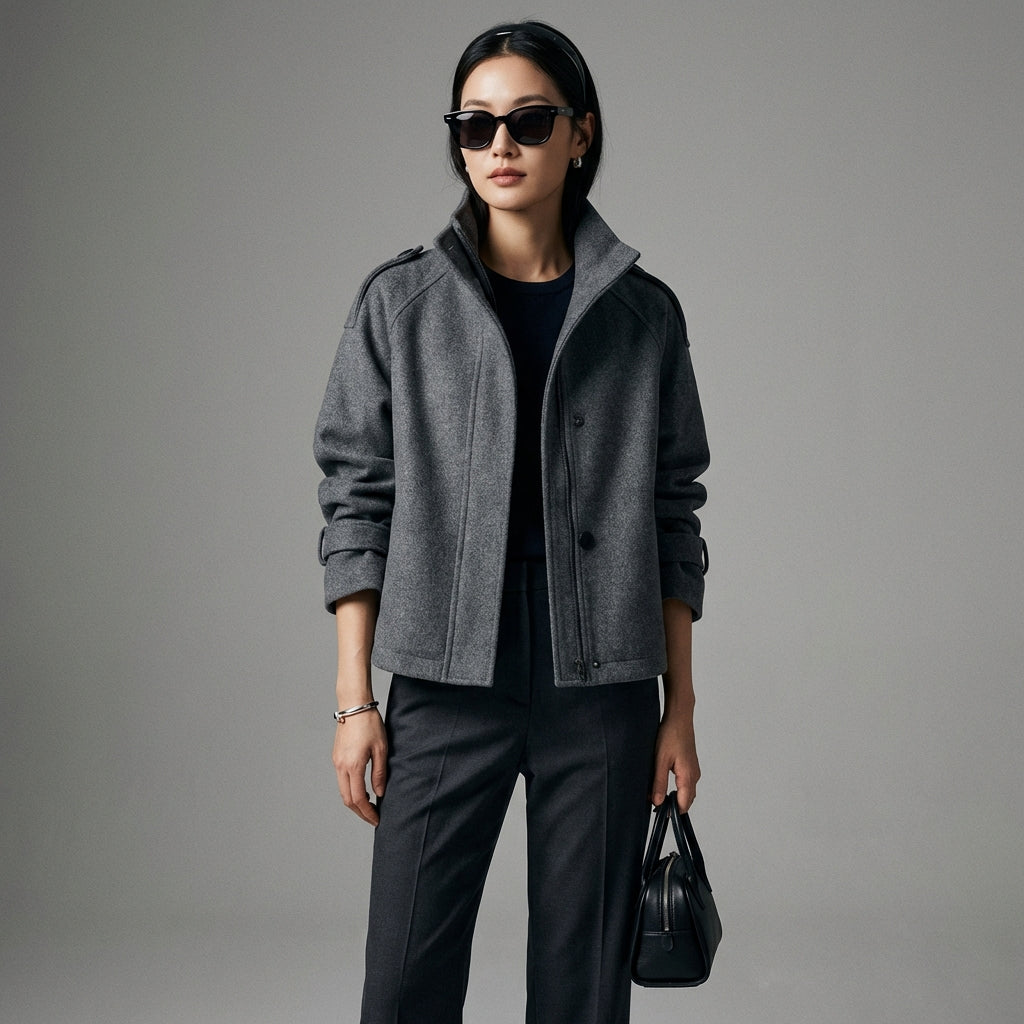 - Typ: Kurze Jacke, lange Ärmel, gerader Schnitt. Ein zeitgemäßes Design, das sich verschiedenen Körperformen anpasst und eine schicke und klare Silhouette bietet.