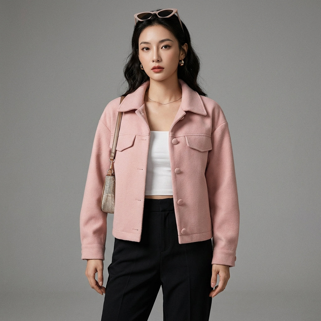 - Typ: Kurze Jacke, Revers. Ein zeitgemäßer Schnitt, der die Silhouette betont und eine große Vielseitigkeit für verschiedene Kombinationen bietet.