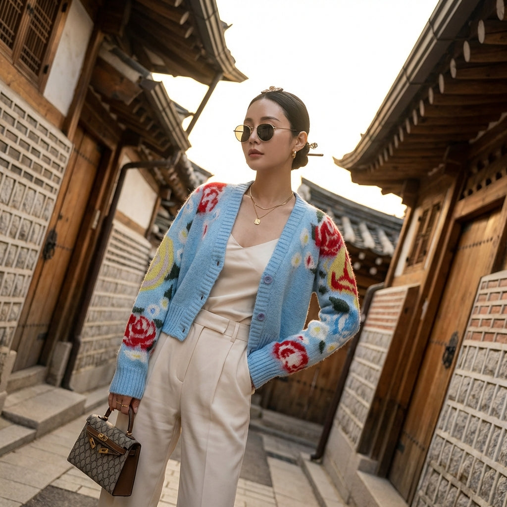 Dieser Cardigan ist das ideale Kleidungsstück zum Überziehen und Kreieren vielfältiger Looks, von lässig bis schick, während er der K-Fashion-Ästhetik treu bleibt.