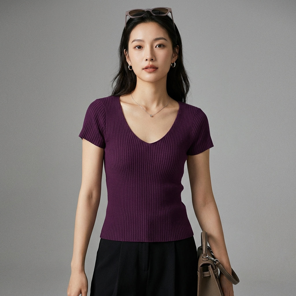 Setzen Sie auf einen minimalistischen und trendigen Look mit diesem gestrickten V-Ausschnitt-Crop-Top. Sein schmaler Schnitt und sein klares Design machen es zu einem Must-have für eine moderne und elegante Silhouette. Perfekt für sonnige Tage oder zum Überziehen! ✨