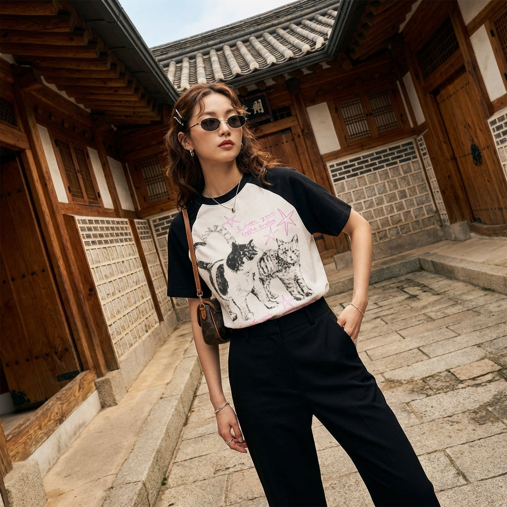 - Stil: Streetwear, Trend, K-Fashion. Dieses T-Shirt verkörpert den Geist der koreanischen urbanen Mode mit einem Retro-Touch, perfekt für alle, die gerne auffallen.