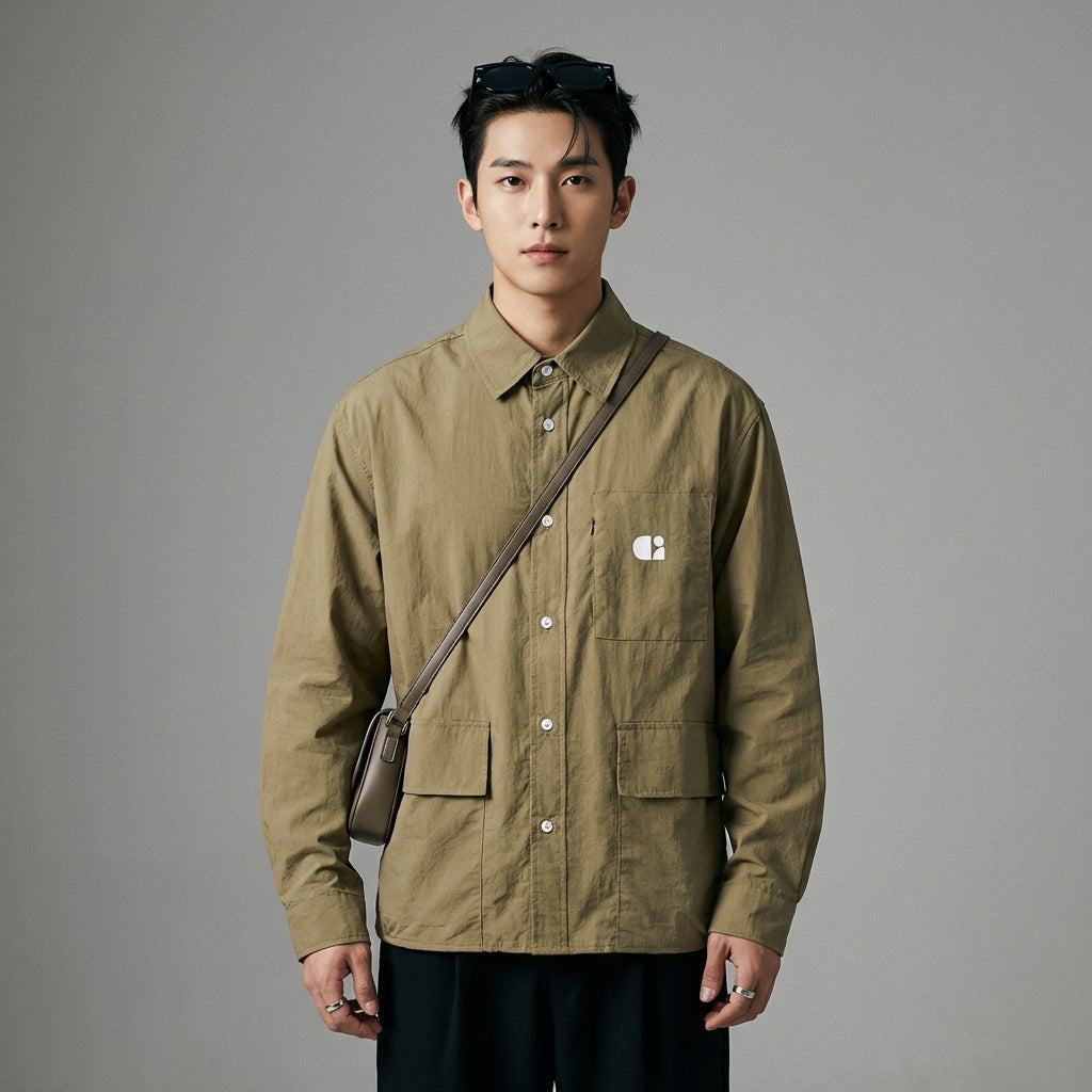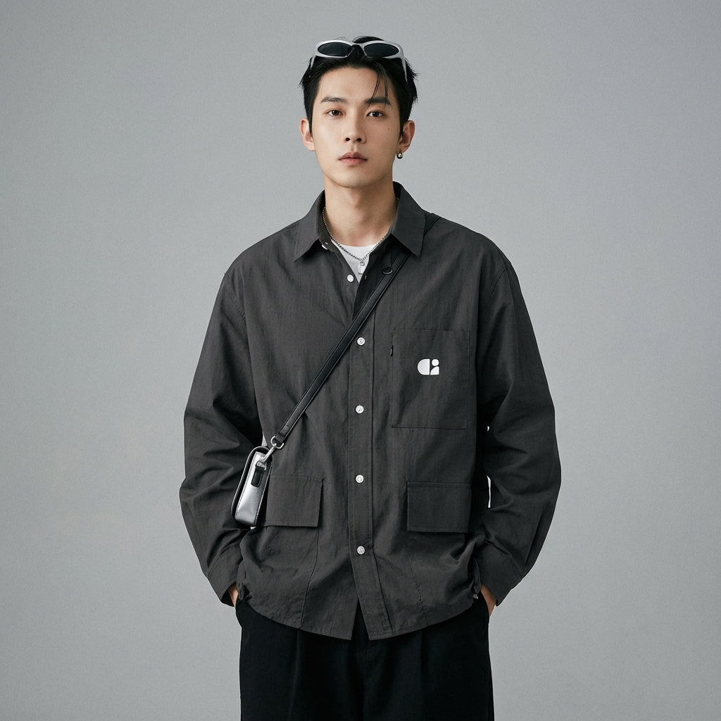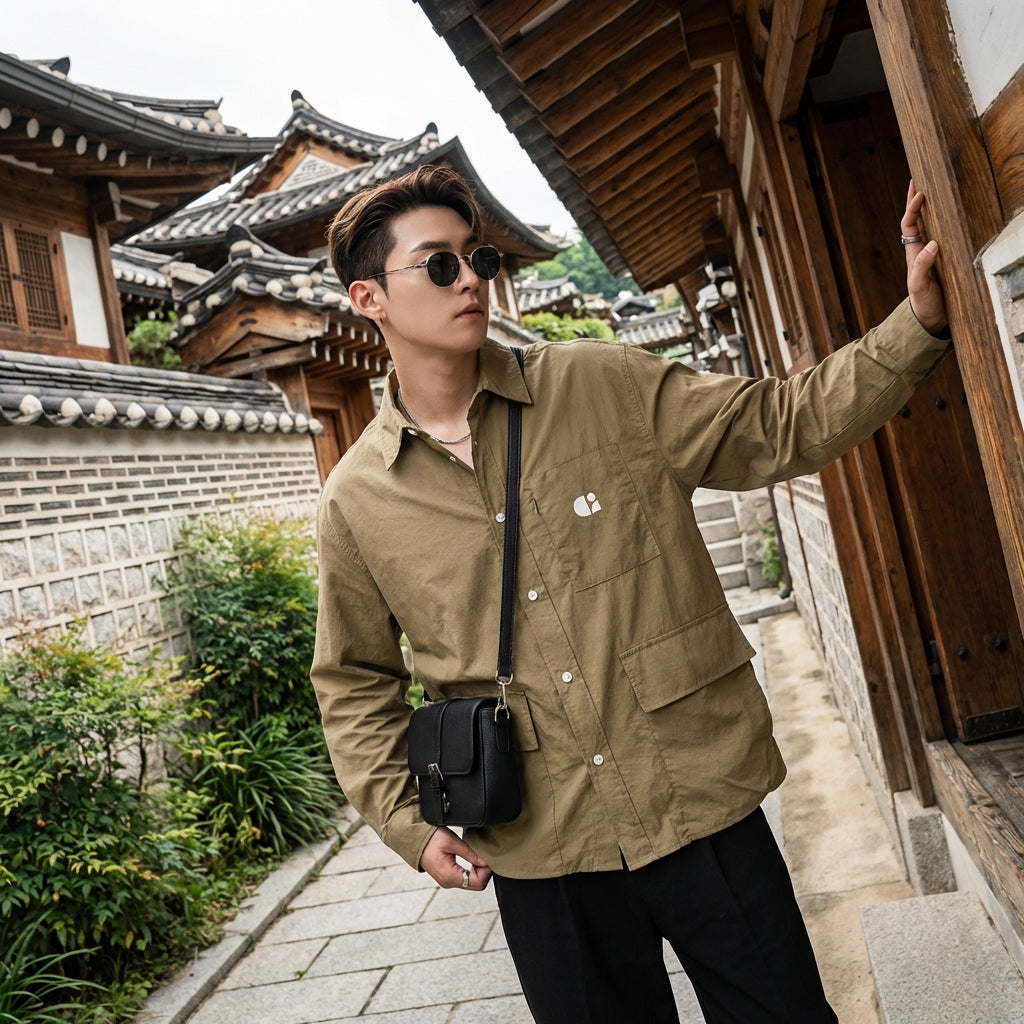 - Stil: Streetwear, Lässig, Modern. Inspiriert von aktuellen Trends, verkörpert dieses Hemd einen urbanen und lässigen Stil, ideal für einen selbstbewussten K-Fashion-Look.