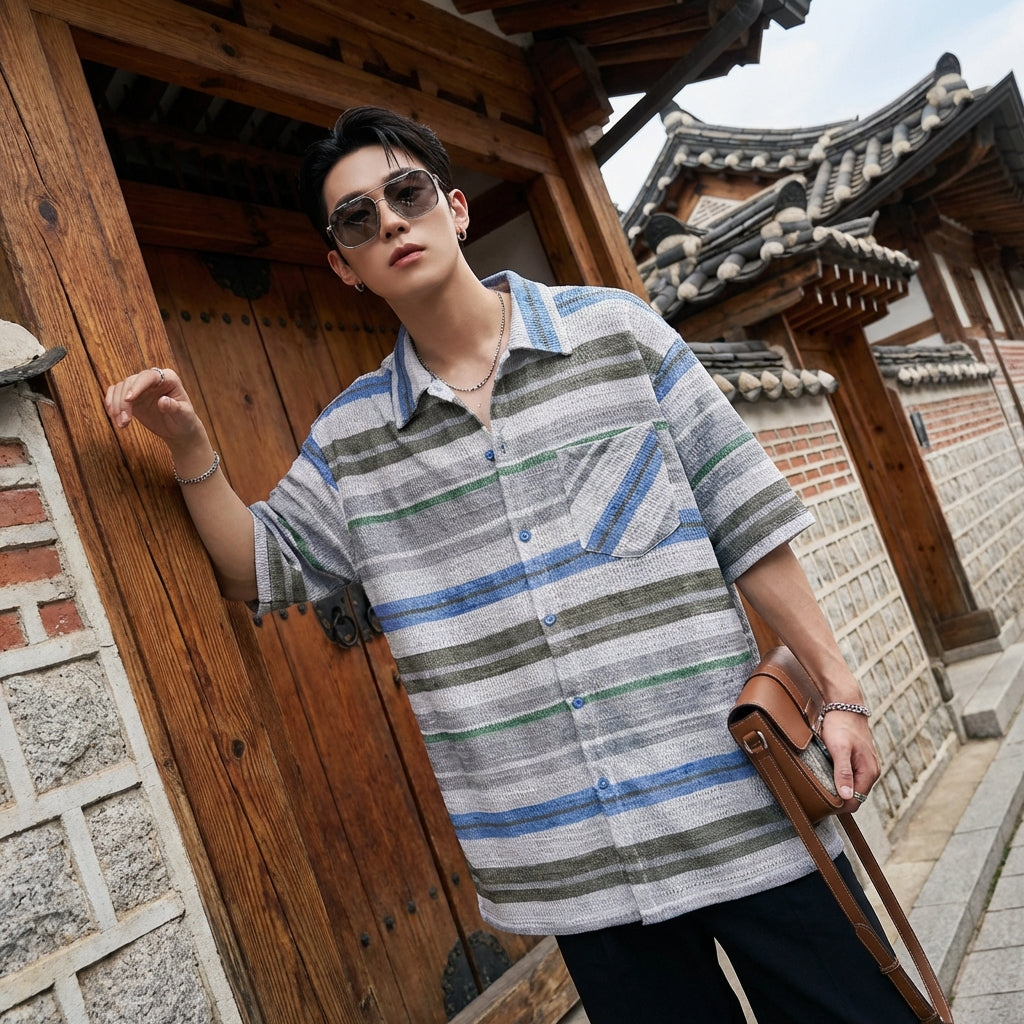 - Stil: Streetwear, K-Fashion, Lässig, Trendig. Dieses Hemd verkörpert den Geist der koreanischen Mode mit seinem weiten Schnitt und den gestreiften Mustern, perfekt für einen urbanen und angesagten Look.