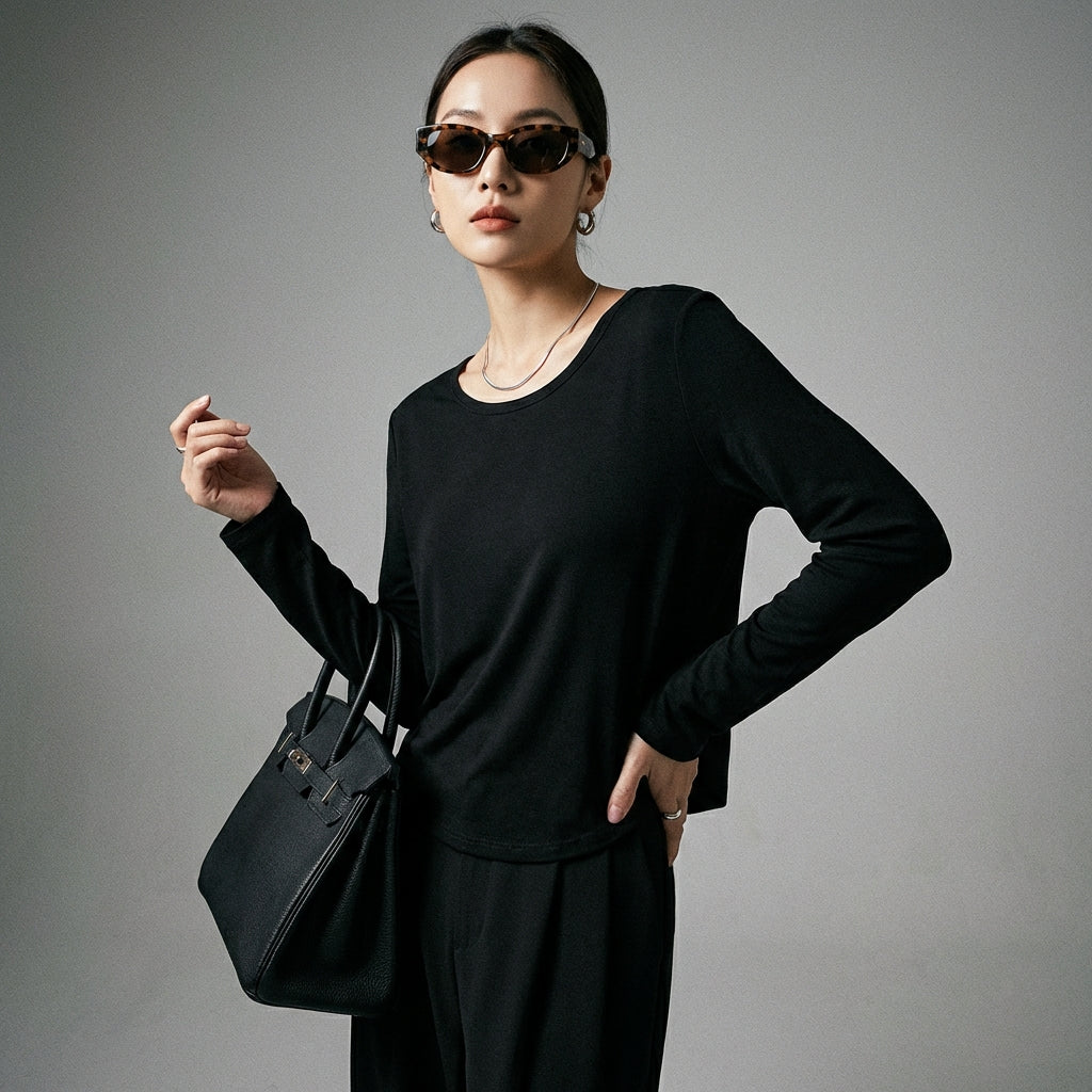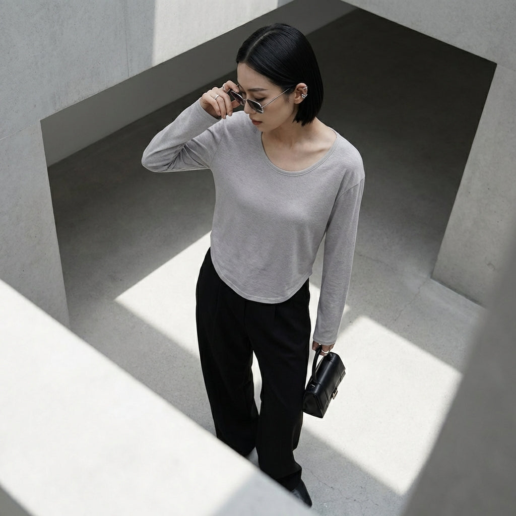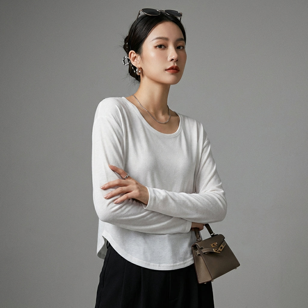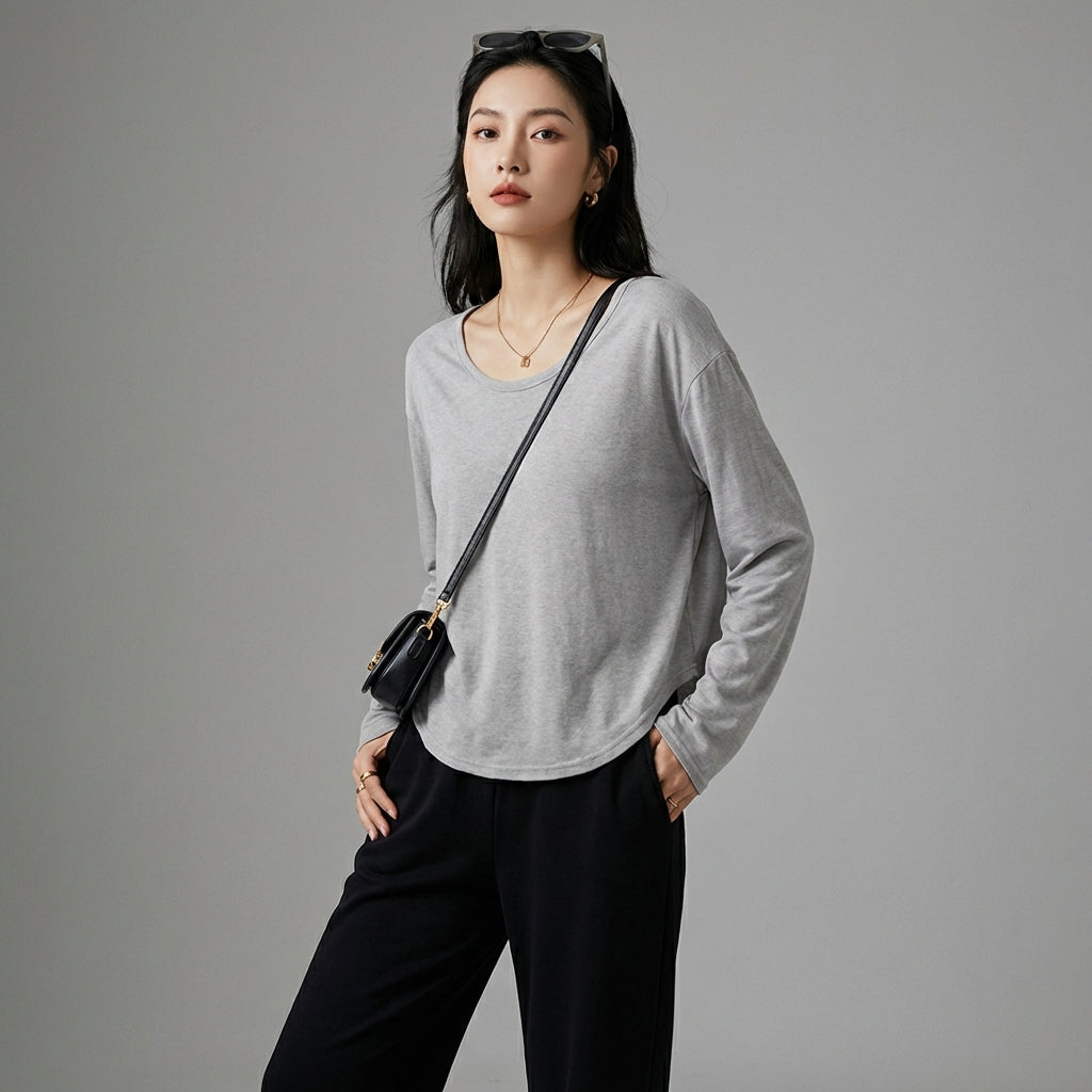 Kreieren Sie einen lässig-schicken Look mit diesem Langarm-T-Shirt mit Rundhalsausschnitt. Sein lockerer Schnitt und minimalistisches Design machen es zu einem vielseitigen Essential für jede Garderobe, die von koreanischer Mode inspiriert ist! ✨