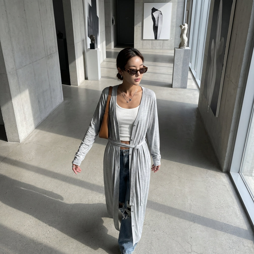 Verleihen Sie sich einen eleganten und lässigen Look mit unserem langen Gürtelcardigan, einem Must-have der koreanischen Mode. Sein lockerer Schnitt und der Gürtel an der Taille schaffen eine schmeichelhafte und moderne Silhouette, perfekt für alle Gelegenheiten. Ideal zum Überziehen und um Ihrem Outfit einen Hauch von Raffinesse zu verleihen! ✨