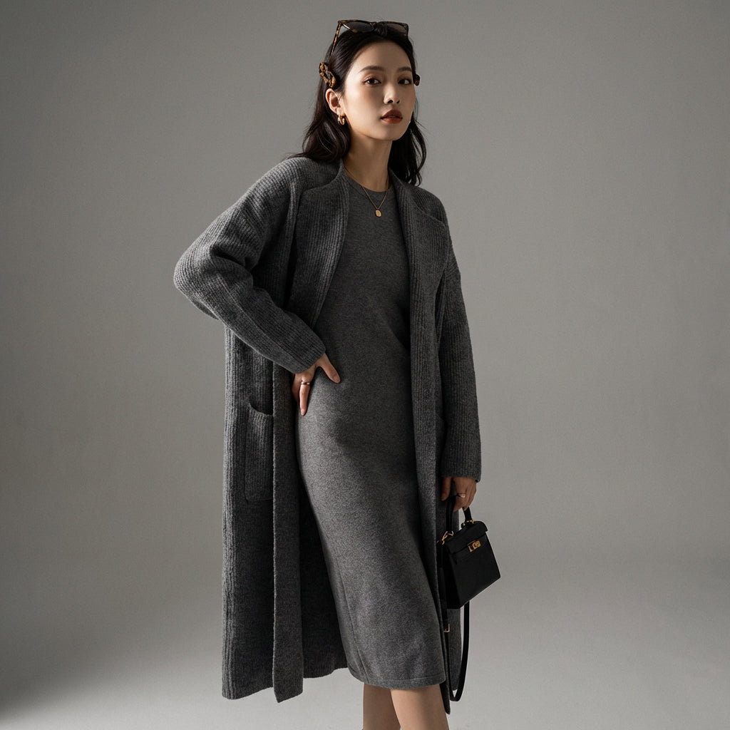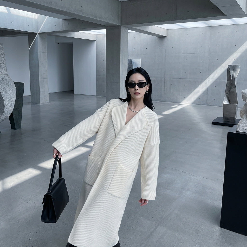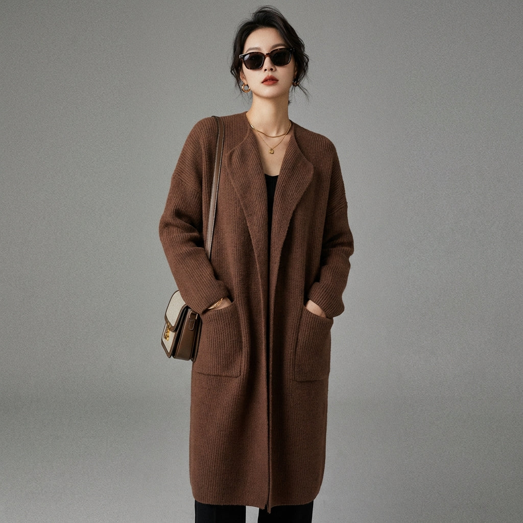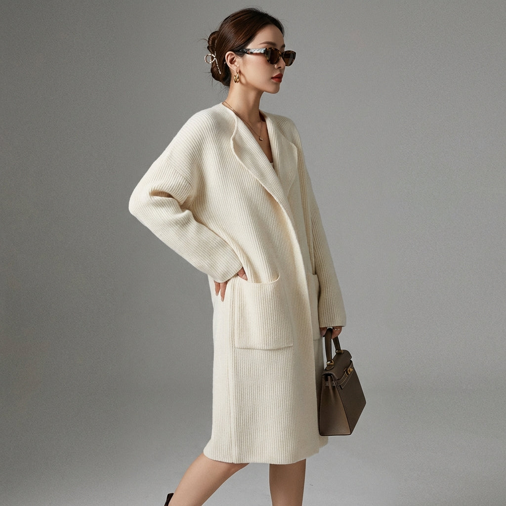 - Typ: Cardigan, Weit, Lang. Ein großzügiger Schnitt und eine Länge, die einen Hauch von Raffinesse und Komfort verleihen.