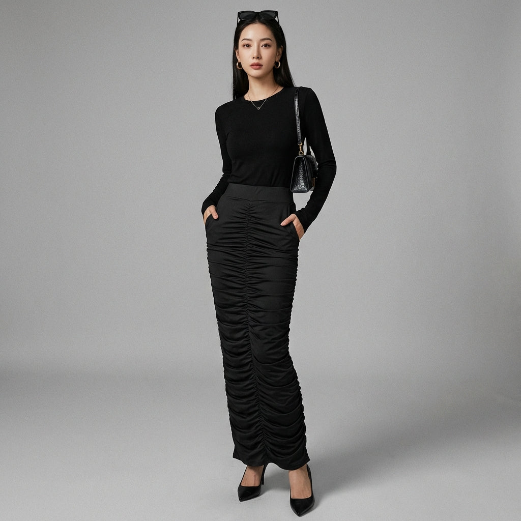 - Typ: Maxirock, Plissiert, Hohe Taille. Ein Midirock, der die Silhouette streckt und die Taille betont, ideal für verschiedene Anlässe.