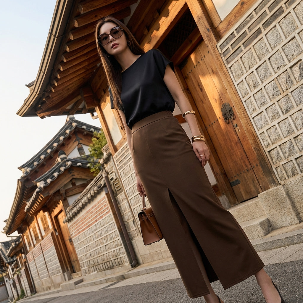 Jupe longue fendue slim marron et noire pour femme - K-fashion élégante