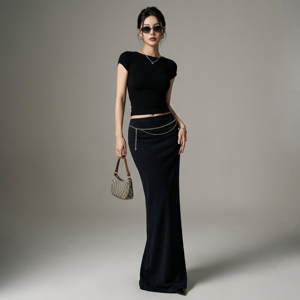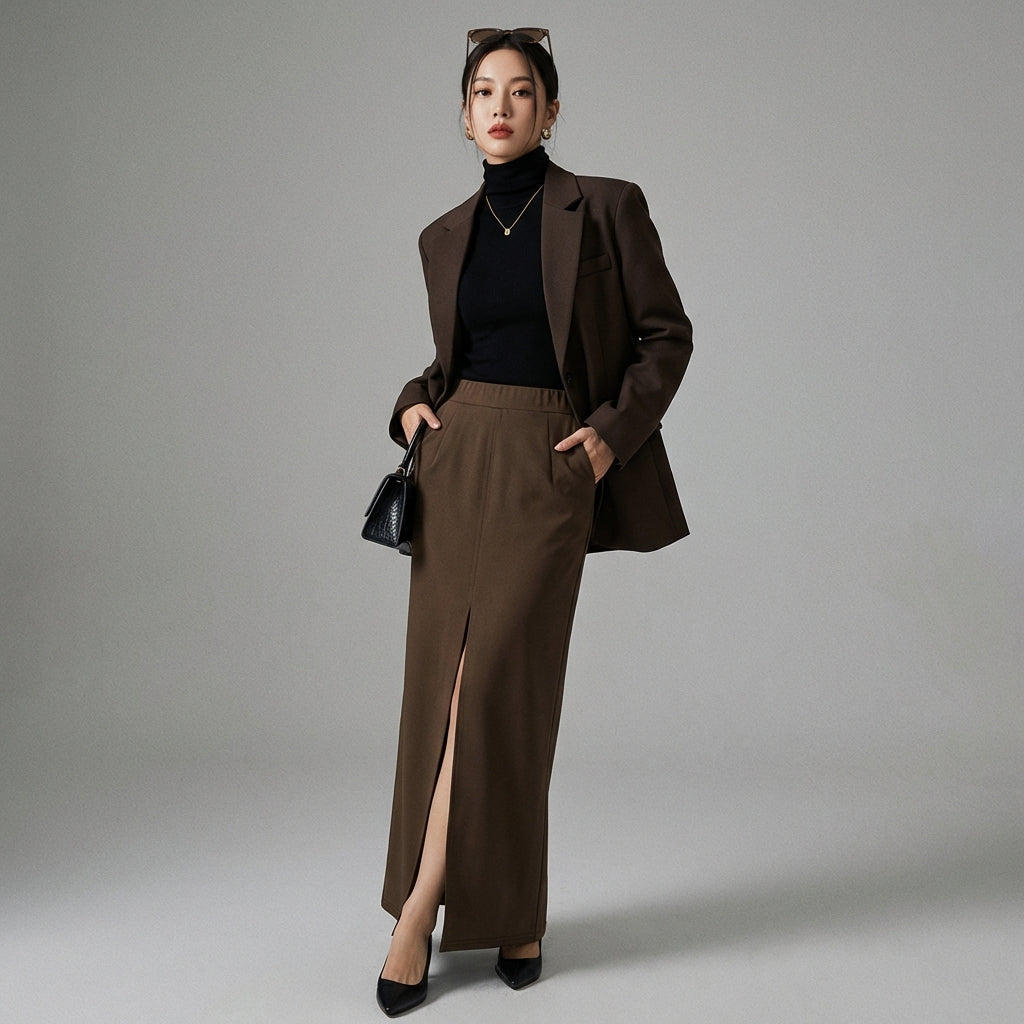 Jupe longue fendue slim marron et noire pour femme - K-fashion élégante - Taille S