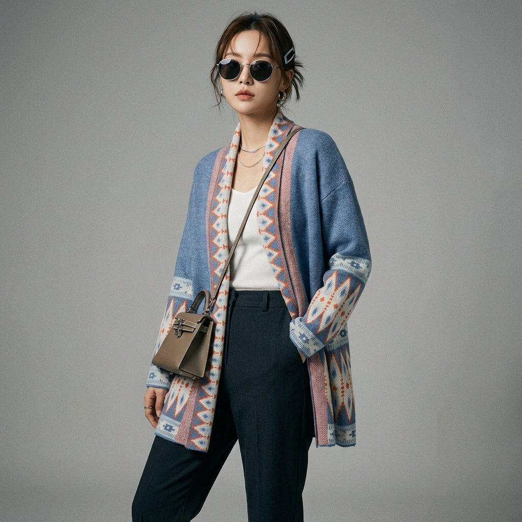Kreieren Sie einen lässigen und eleganten Look mit unserem locker gestrickten langen Cardigan. Ideal zum Überziehen und um Ihren Outfits einen Hauch von Stil zu verleihen. Sein geometrisches Muster und sein fließender Schnitt machen ihn zu einem Must-have der koreanischen Mode! ✨