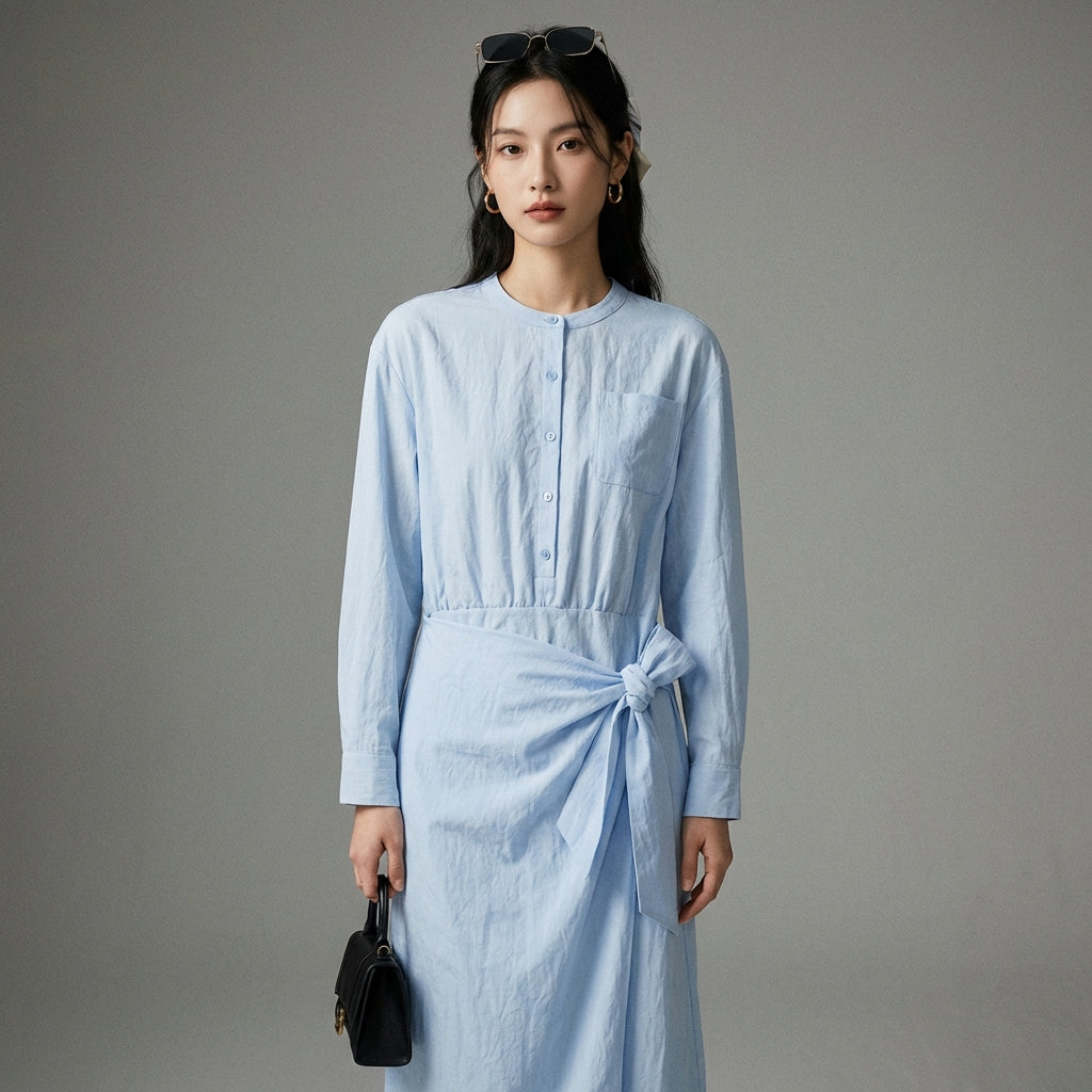 Entscheiden Sie sich für einen eleganten und lässigen Look mit unserem himmelblauen Maxikleid. Der Rundhalsausschnitt und die langen Ärmel machen es zu einem idealen Kleidungsstück für alle Gelegenheiten. Die gebundene Taille betont zart die Silhouette und bietet unvergleichlichen Komfort und Stil! 💙