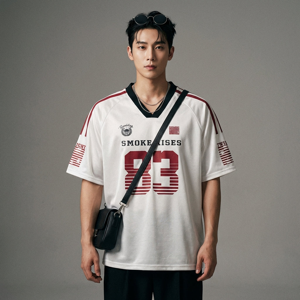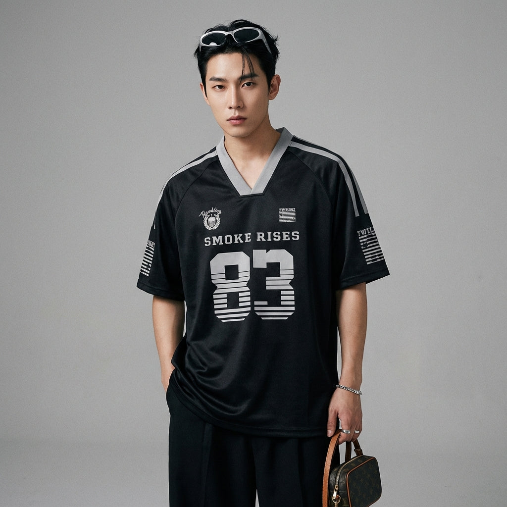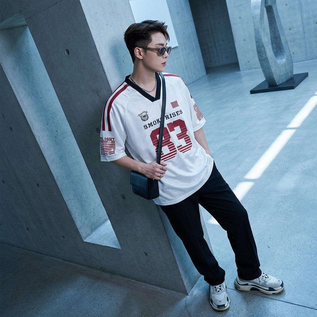 Kreieren Sie einen lässigen und trendigen Look mit unserem kurzärmeligen V-Ausschnitt-T-Shirt, ideal für Sommertage. Sein lockeres Design und der moderne Aufdruck machen es zu einem Must-have für einen selbstbewussten Streetwear-Stil! ✨