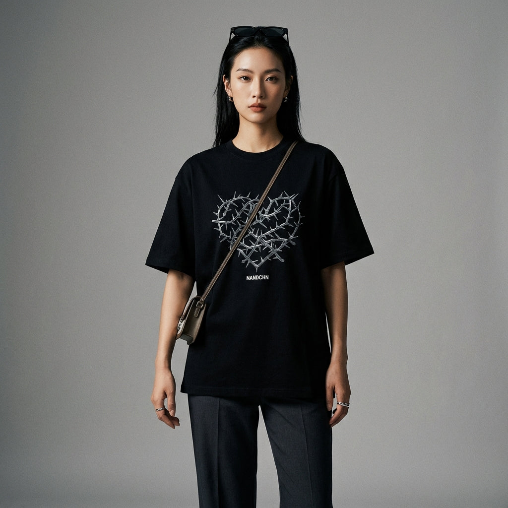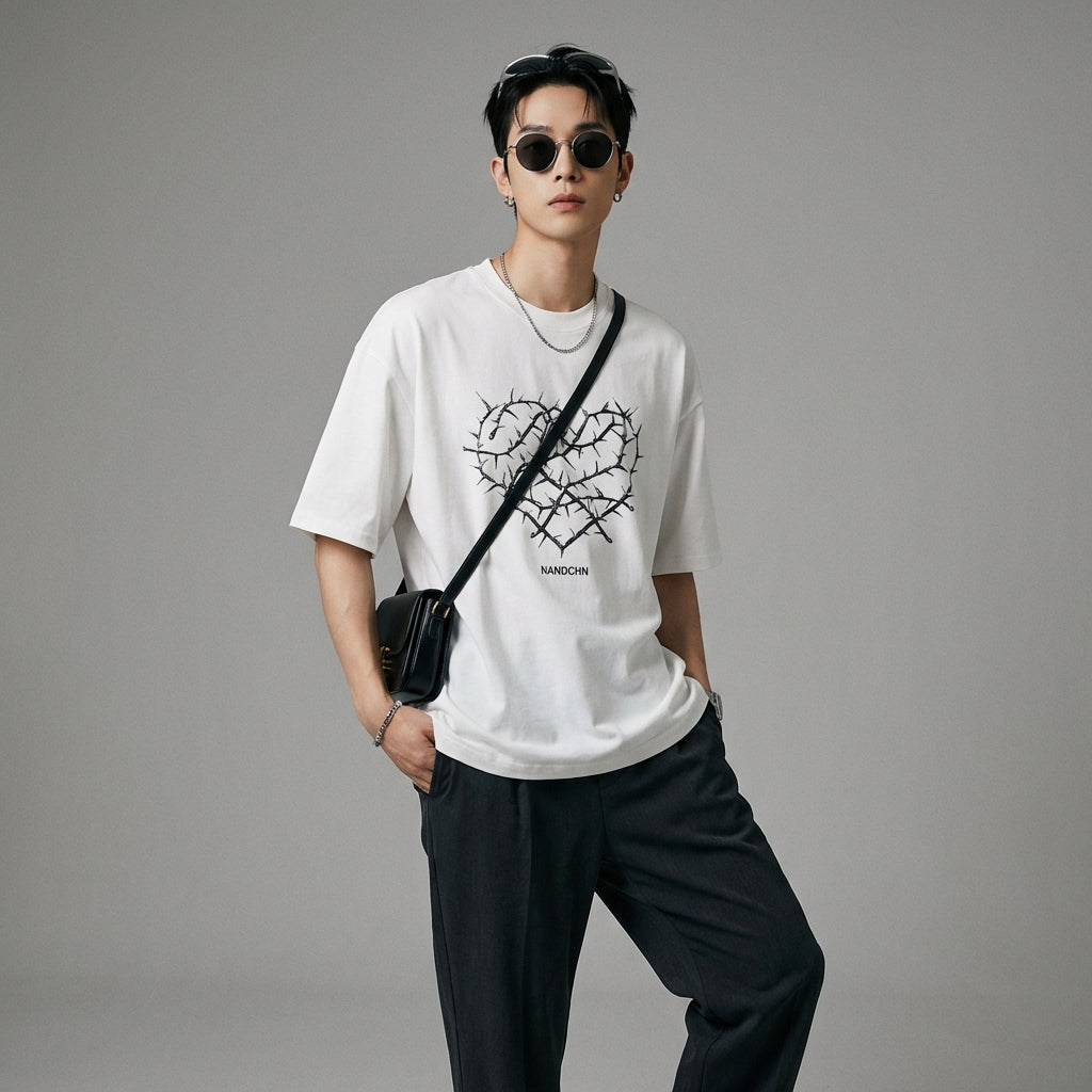 Kreieren Sie einen lässigen und trendigen Look mit unserem lockeren T-Shirt mit Herz-Print. Dieses Unisex-Modell, inspiriert von koreanischer Mode, zeichnet sich durch sein Buchstabenmotiv und seinen weiten Schnitt aus, perfekt für einen selbstbewussten Streetwear-Stil! 💖