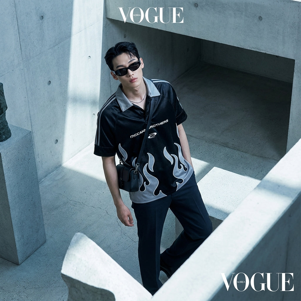 - Stil: Streetwear, Trend, K-Fashion. Dieses Poloshirt verkörpert den Geist der koreanischen urbanen Mode, mit einem lässigen Schnitt und einem markanten Muster.